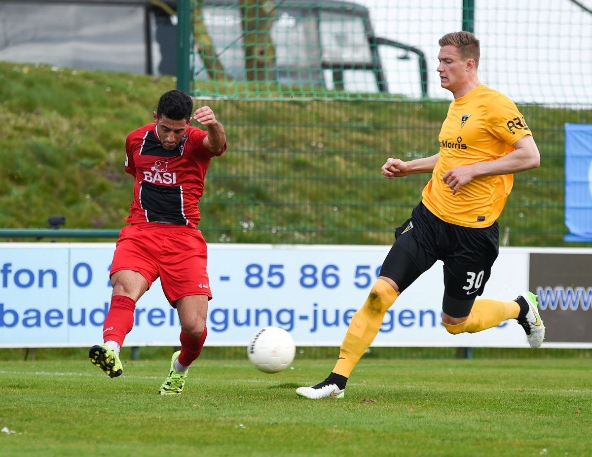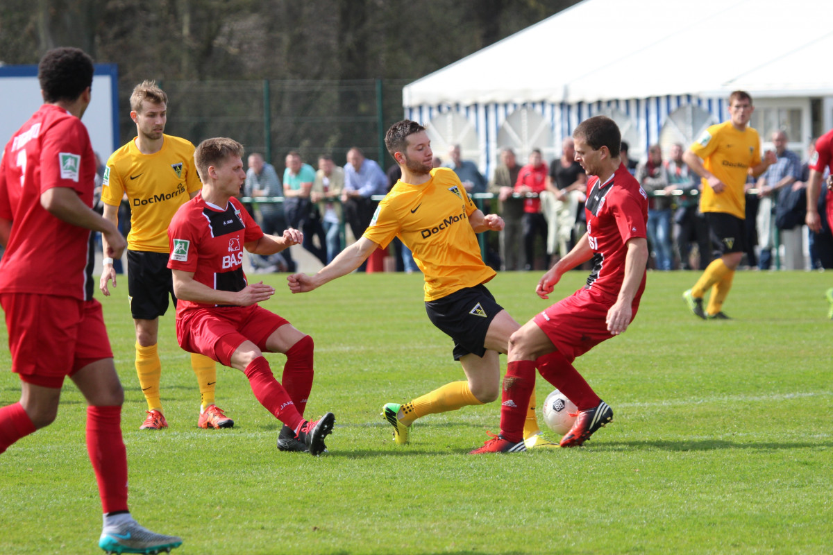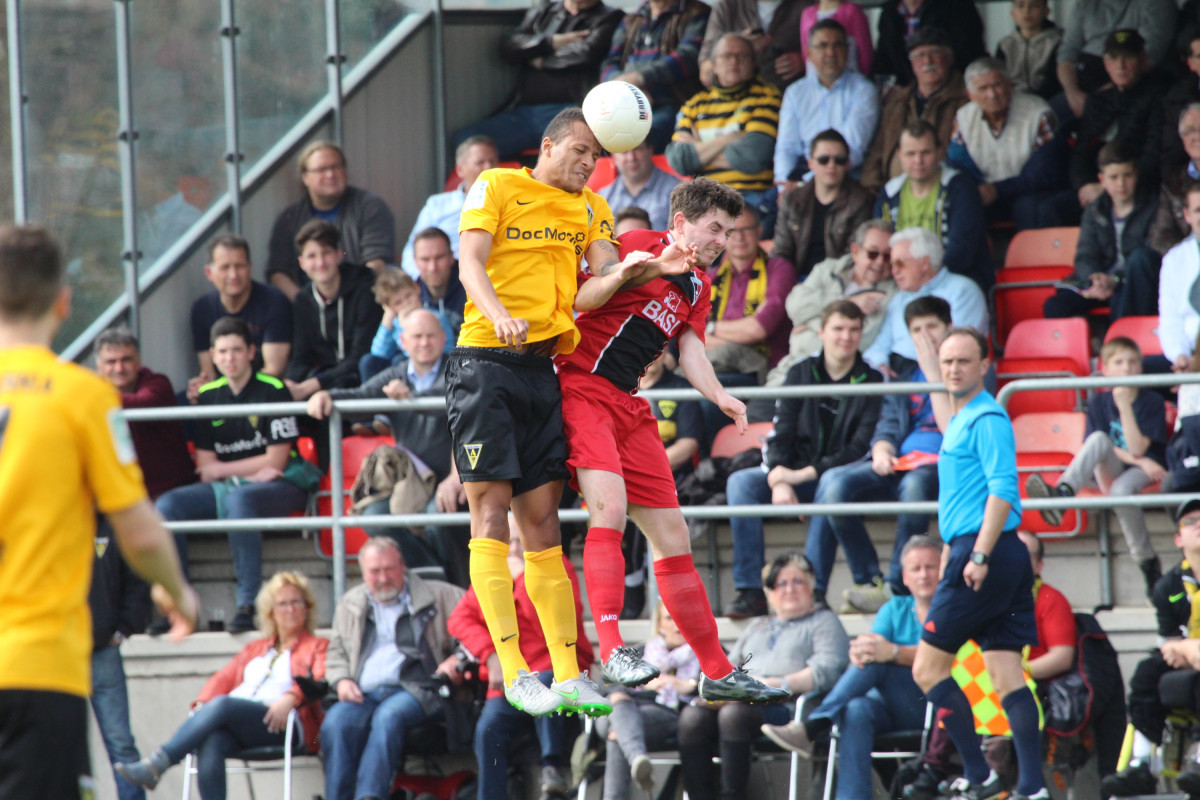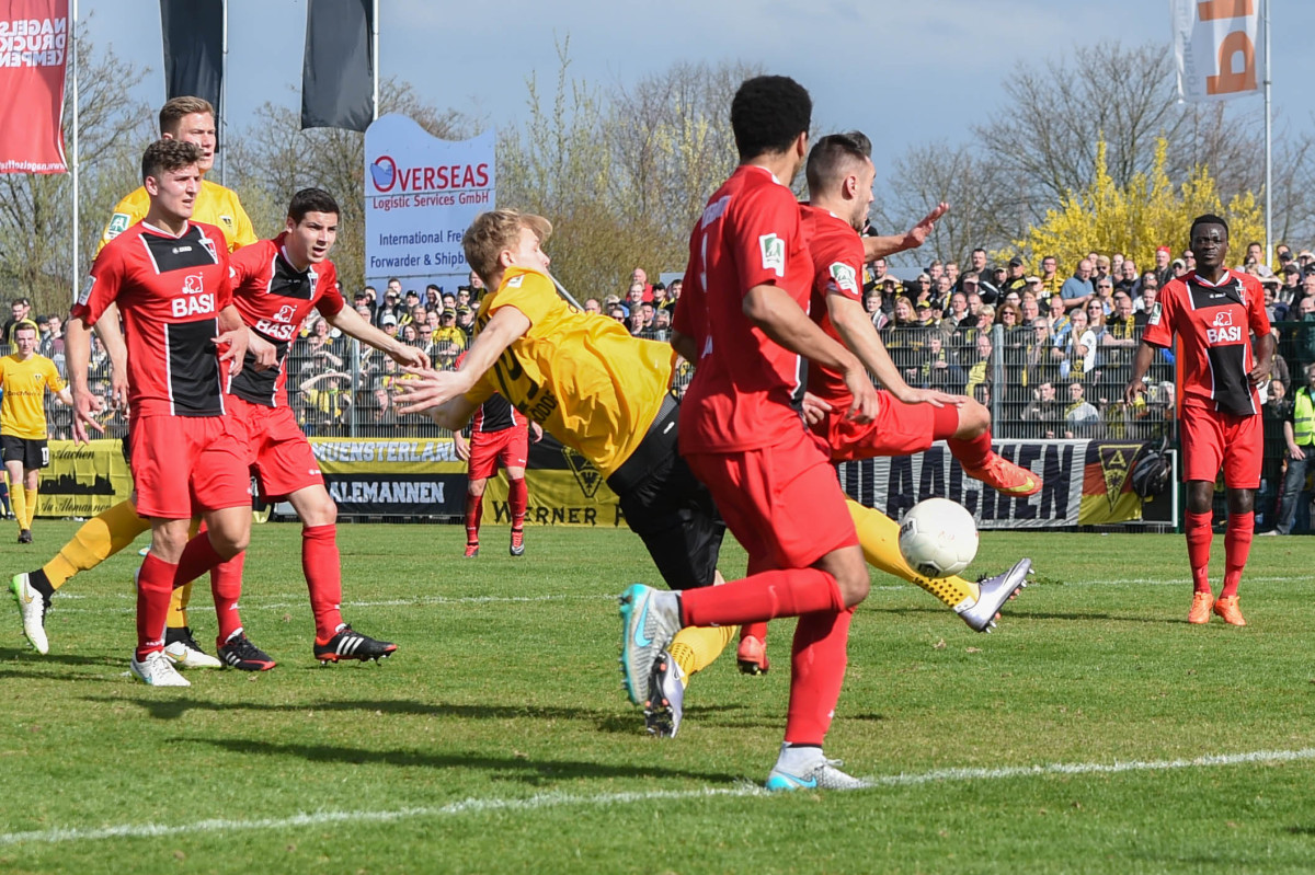 Tim Lünenbach ersetze vor 1.011 Zuschauern den verletzten Nils Winter auf der linken Abwehrseite. Außerdem begann Jerome Propheter anstelle von Meik Kühnel im Mittelfeld. Der Favorit begann engagiert und hatte nach sechs Minuten die erste Gelegenheit. Rüter flankte von rechts, Engelbrecht nahm die Kugel aus acht Metern direkt, zielte aber links am Tor vorbei. Im Anschluss an eine Dowidat-Ecke hämmerte Rossmann die Kugel aus dem Rückraum anschließend knapp drüber (9.). „Wir haben gut ins Spiel gefunden und sind in den ersten 15-20 Minuten einige Male auf dem Flügel durchgekommen“, war Fuat Kliic mit der Anfangsphase durchaus zufrieden. Leider gelang es seiner Elf in der Folgezeit nicht, den Druck aufrecht zu erhalten. In der 23. Minute rannten die Alemannen nach einem eigenen Freistoß wie bereits gegen Wattenscheid in einen Konter des Gegners. Richter spielte Lambertz frei, der Kleinheider umkurvte und zum 1:0 einschob. Mit diesem überraschenden Ergebnis wurden auch die Seiten getauscht.