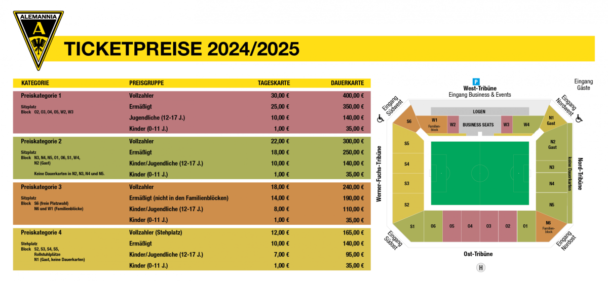 - Dauerkartenbesitzer der Saison 2023/24 wurden am 30.5. per E-Mail angeschrieben. Bei fehlender oder nicht erreichbarer E-Mail-Adresse wurden Anfang Juni Anschreiben per Briefpost verschickt. Soll die Zahlung per Überweisung erfolgen und die Reservierungsdaten nicht vorliegen, können diese unter ticketing@alemannia-aachen.de angefragt werden. Alternativ können Dauerkarten im Fanshop am Tivoli verlängert werden.