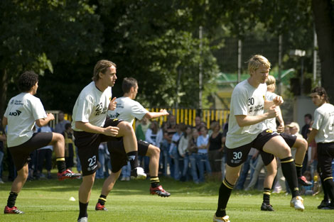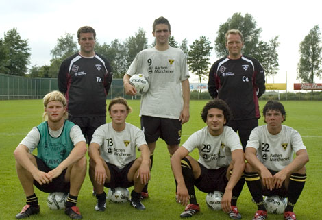 Nach dem Einkleiden und dem Wiegen richteten Präsident Professor Horst Heinrichs, Sportdirektor Jörg Schmadtke und Trainer Dieter Hecking einige Worte an die Mannschaft, ehe es auf den Platz ging. Nach lockerer Einheit erzielte Sascha Rösler per Kopf das einzige Tor im anschließenden Trainingsspiel.Natürlich war auch der am Mittag bekannt gegebene Spielplan ein Thema. Die Alemannia startet mit einem Auswärtsspiel bei Bayer Leverkusen in die Saison. „Die Bayern wären mir noch lieber gewesen“, so Reiner Plaßhenrich. Ähnlich sah es Nico Herzig. „Wir müssen eh gegen alle spielen, also warum nicht am Anfang Leverkusen?“