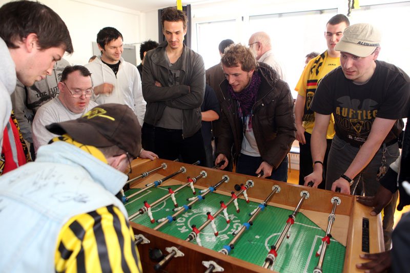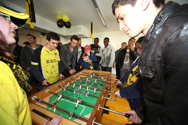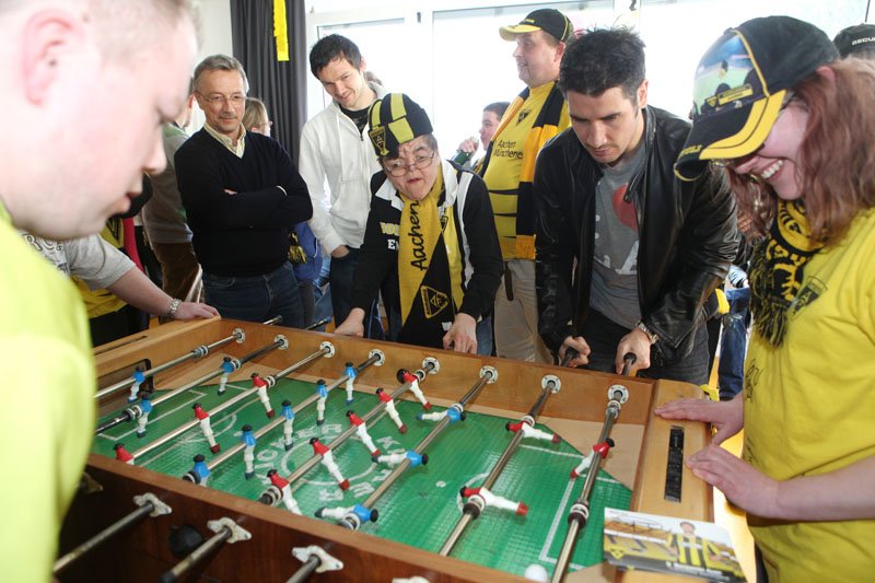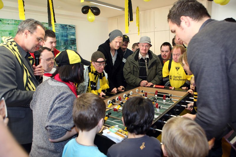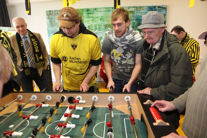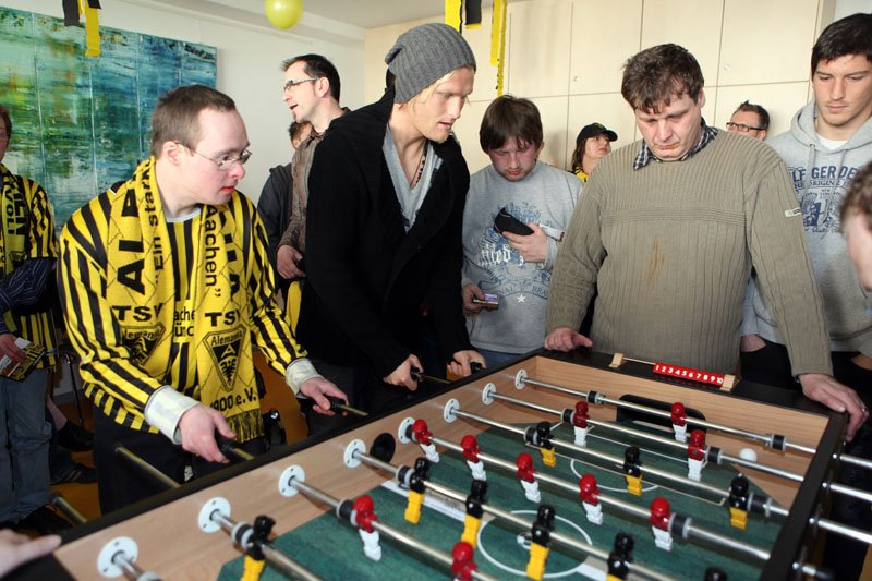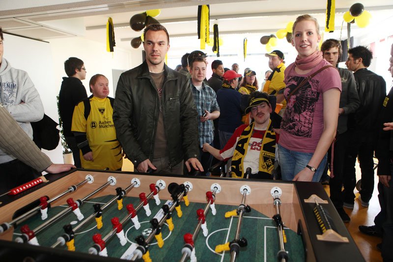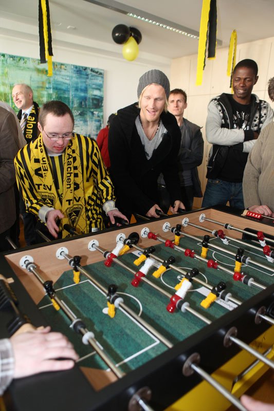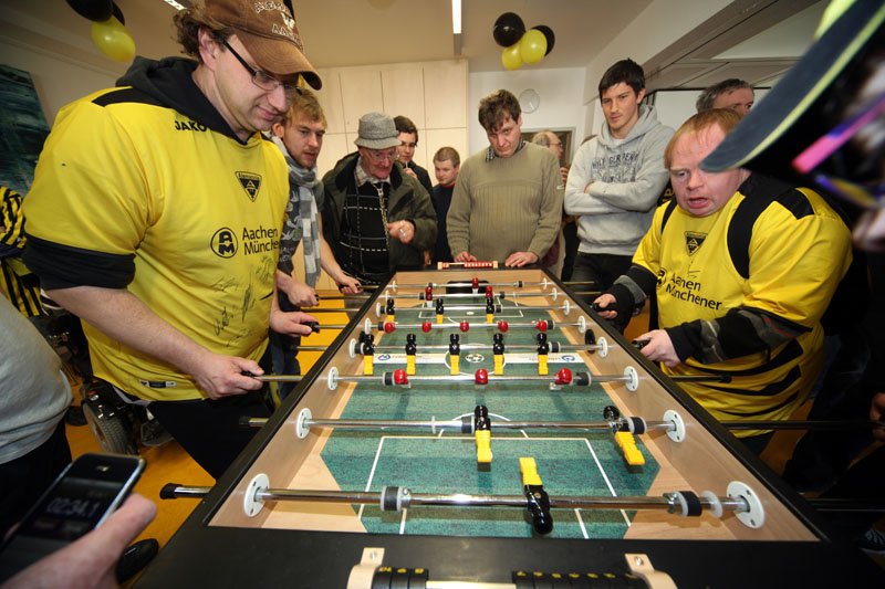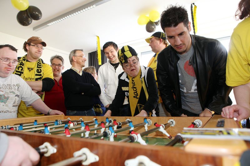 Nach der stürmischen Begrüßung und den ersten Autogrammwünschen wurde zunächst ein gemeinsames Mittagessen eingenommen, ehe der Ball rollte. An den beiden Kickern im „Cafe Life“ glühten die Stangen, als die Paarungen aus jeweils einem Menschen mit Behindertung und einem Spieler aufeinandertrafen. Teilweise konnte man sein eigenes Wort nicht mehr verstehen, so laut wurde es beim Turnier. „Rational ist diese Begeisterung gar nicht zu erklären. Alemannia geht den Leuten einfach unter die Haut, speziell unseren Menschen mit Behinderung“, erklärt Frings, der es sich nicht nehmen ließ, an der Seite von Benny Auer das letzte Turnierspiel zu gewinnen – sehr zum Leidwesen von Coach Michael Krüger, der mit seinem jungen Mitstreiter keine Chance hatte.