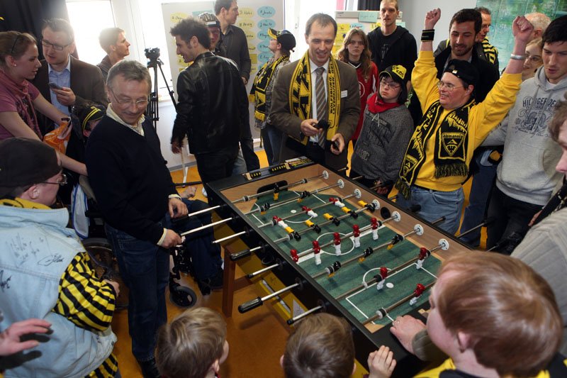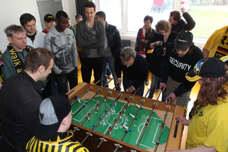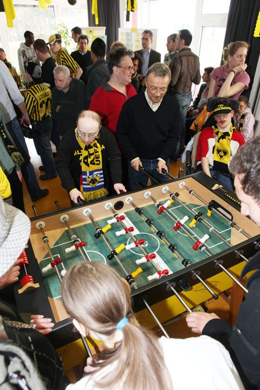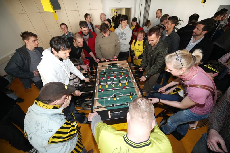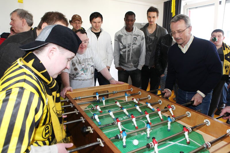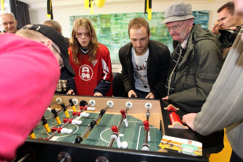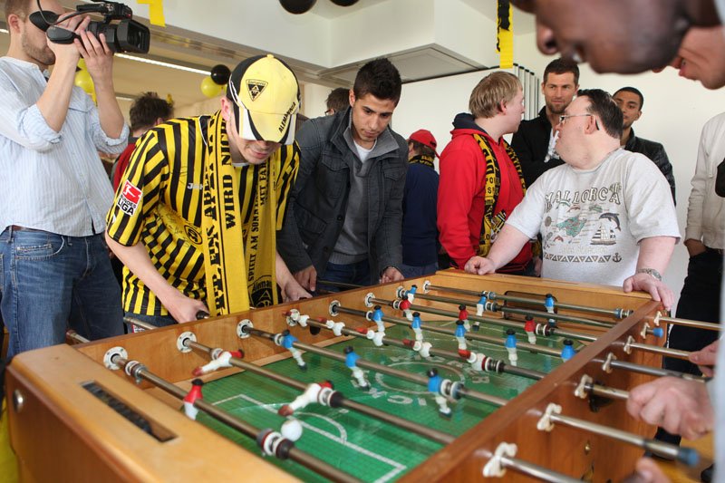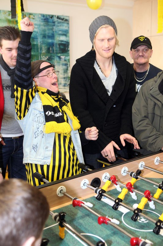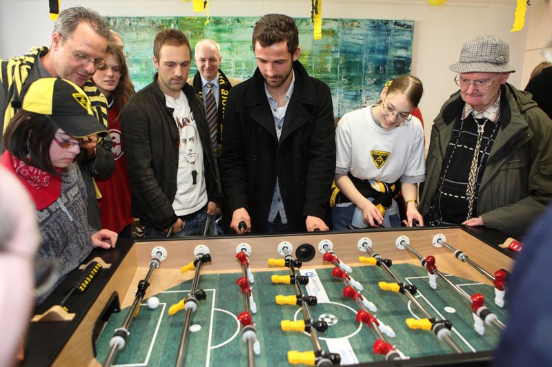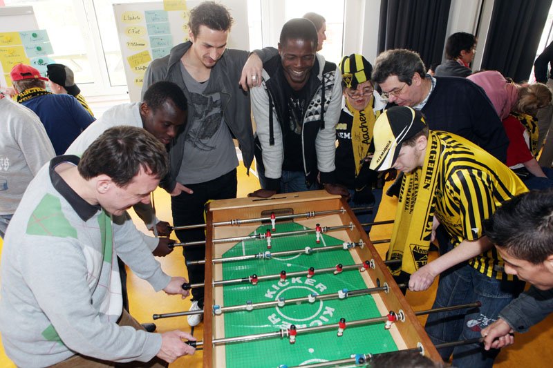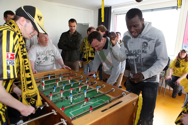 Nach der stürmischen Begrüßung und den ersten Autogrammwünschen wurde zunächst ein gemeinsames Mittagessen eingenommen, ehe der Ball rollte. An den beiden Kickern im „Cafe Life“ glühten die Stangen, als die Paarungen aus jeweils einem Menschen mit Behindertung und einem Spieler aufeinandertrafen. Teilweise konnte man sein eigenes Wort nicht mehr verstehen, so laut wurde es beim Turnier. „Rational ist diese Begeisterung gar nicht zu erklären. Alemannia geht den Leuten einfach unter die Haut, speziell unseren Menschen mit Behinderung“, erklärt Frings, der es sich nicht nehmen ließ, an der Seite von Benny Auer das letzte Turnierspiel zu gewinnen – sehr zum Leidwesen von Coach Michael Krüger, der mit seinem jungen Mitstreiter keine Chance hatte.