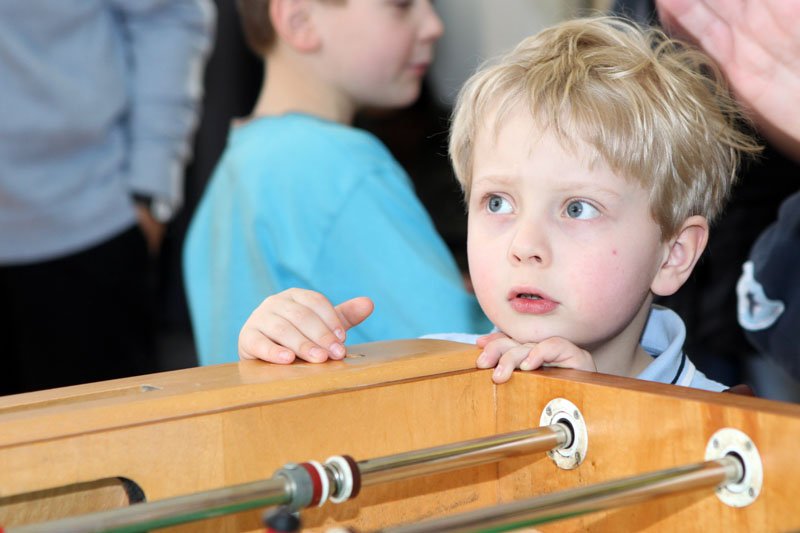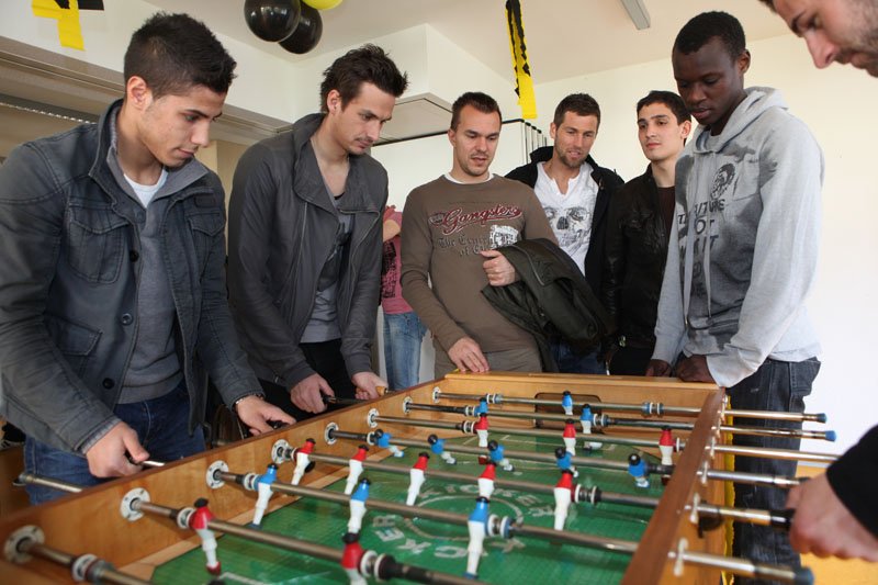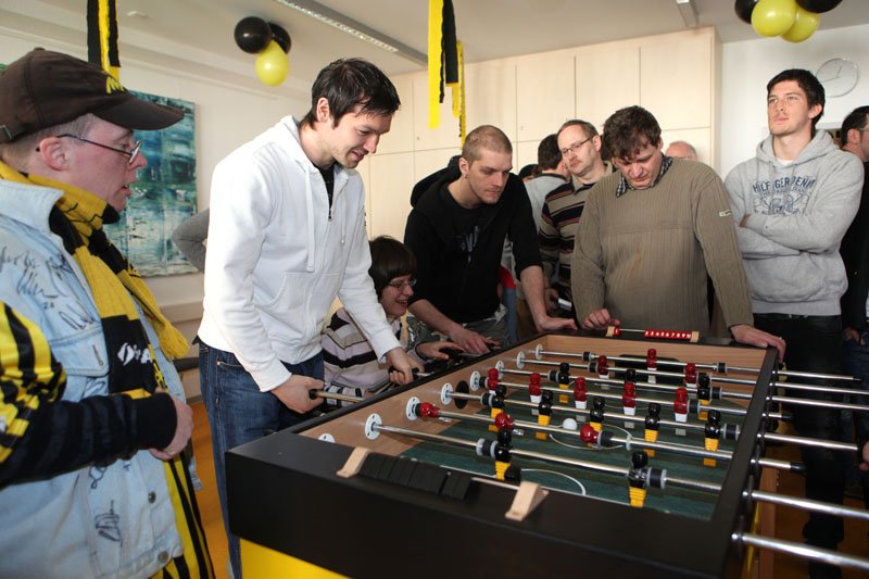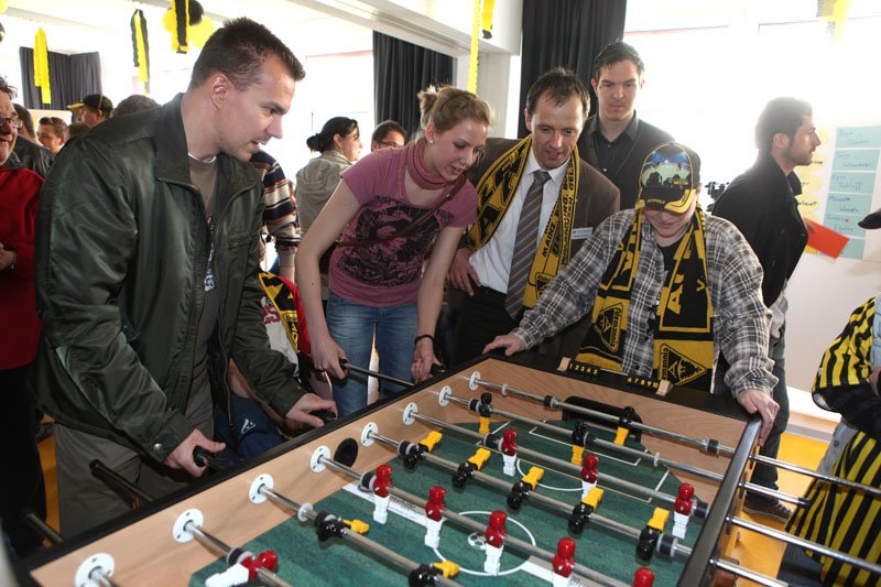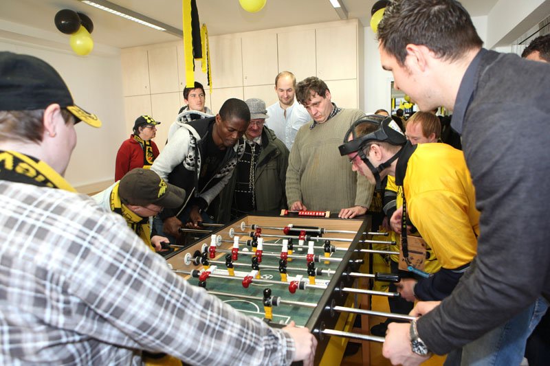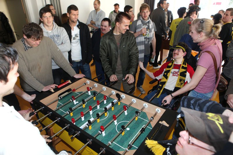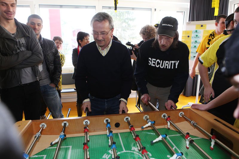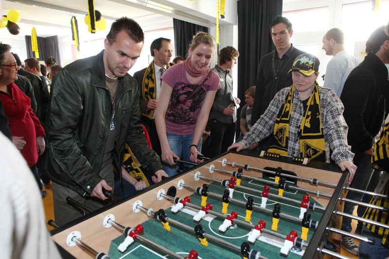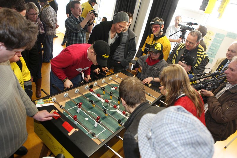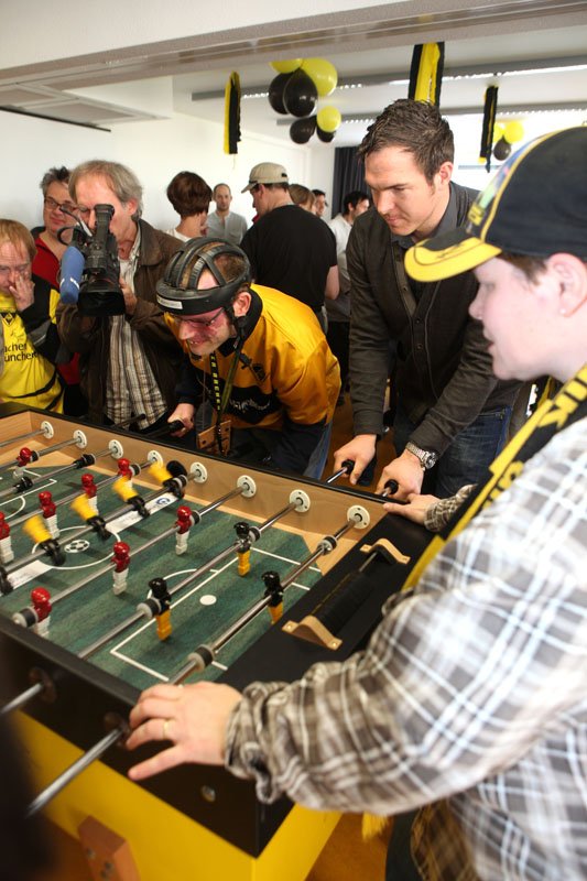 Nach der stürmischen Begrüßung und den ersten Autogrammwünschen wurde zunächst ein gemeinsames Mittagessen eingenommen, ehe der Ball rollte. An den beiden Kickern im „Cafe Life“ glühten die Stangen, als die Paarungen aus jeweils einem Menschen mit Behindertung und einem Spieler aufeinandertrafen. Teilweise konnte man sein eigenes Wort nicht mehr verstehen, so laut wurde es beim Turnier. „Rational ist diese Begeisterung gar nicht zu erklären. Alemannia geht den Leuten einfach unter die Haut, speziell unseren Menschen mit Behinderung“, erklärt Frings, der es sich nicht nehmen ließ, an der Seite von Benny Auer das letzte Turnierspiel zu gewinnen – sehr zum Leidwesen von Coach Michael Krüger, der mit seinem jungen Mitstreiter keine Chance hatte.