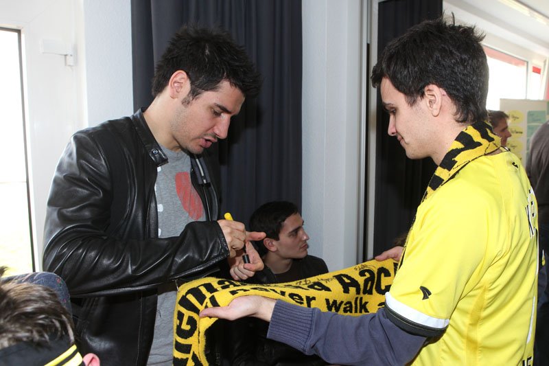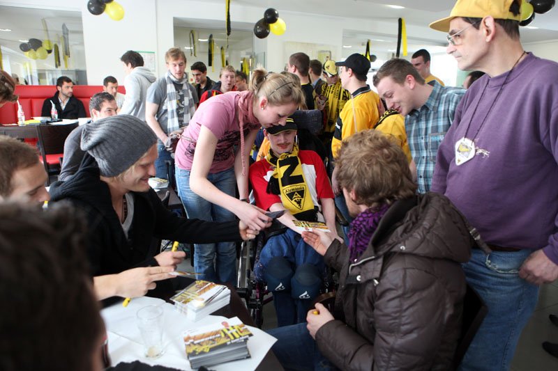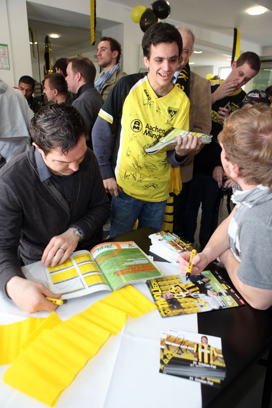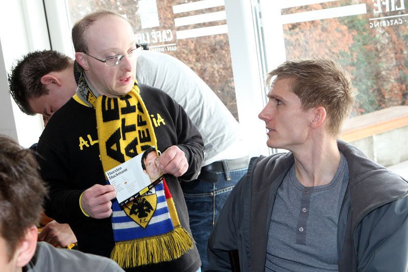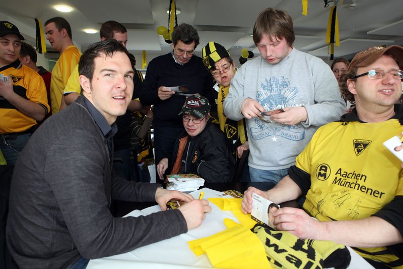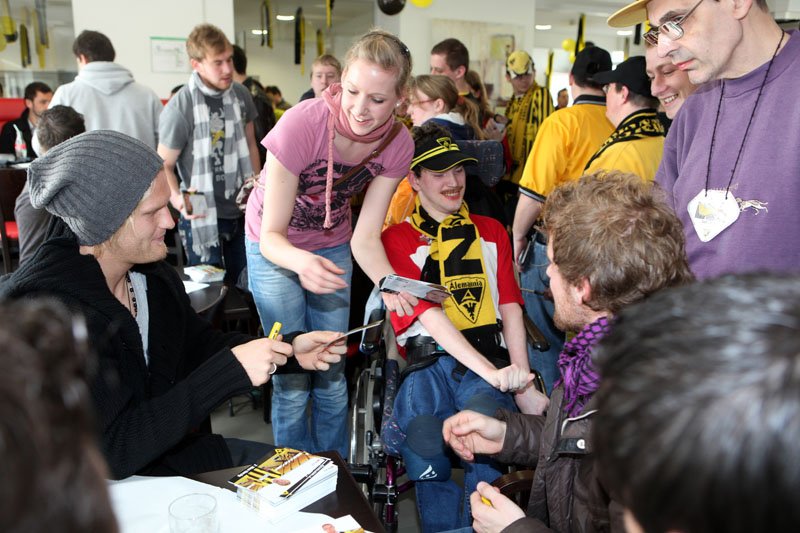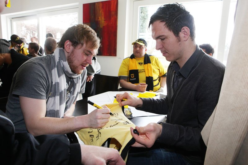 Pure Freude und eine Welle der Begeisterung erlebten die Alemannia-Profis am Mittwoch beim Besuch im Freizeit- und Begegnungszentrum der Lebenshilfe Aachen. Es war so etwas wie der „Antrittsbesuch“ im neuen Lebenshilfe-Haus an der Adenauerallee. Fast der komplette Kader samt Trainerteam war gekommen, um mit den behinderten Menschen einen fröhlichen Nachmittag zu verbringen.