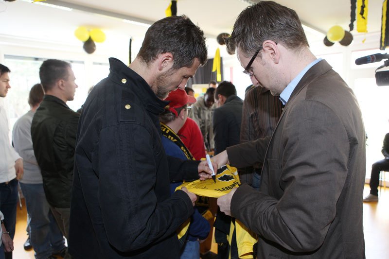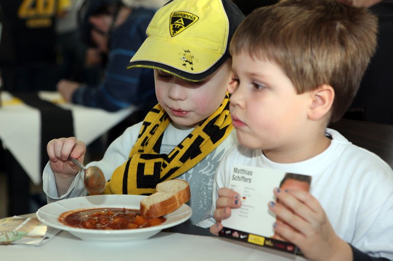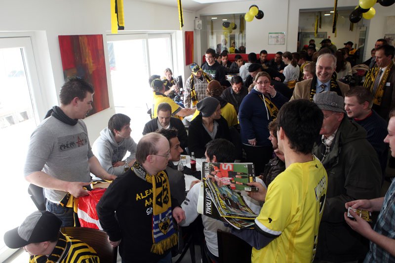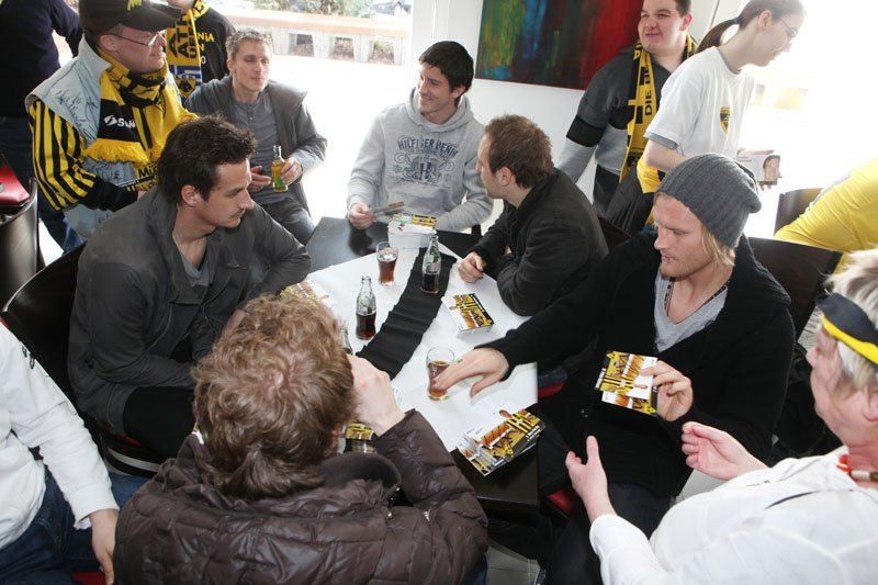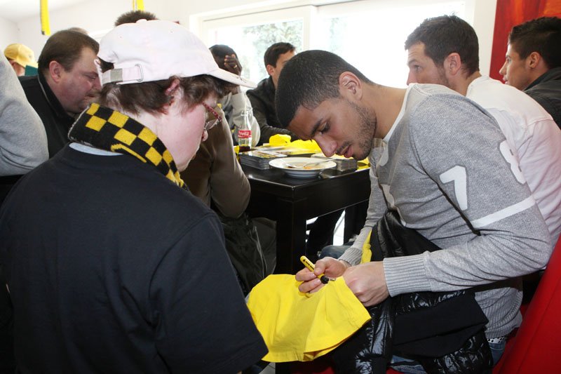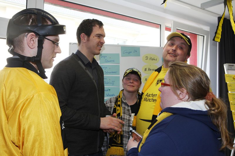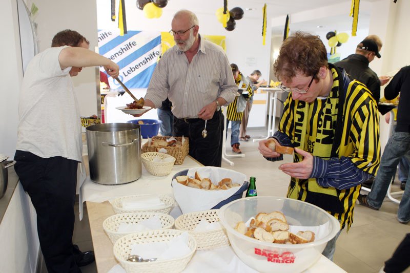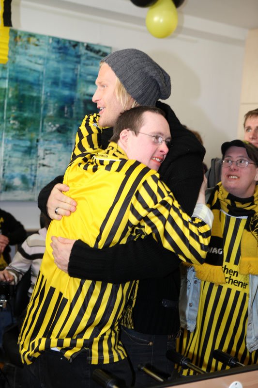 Natürlich hatten die Alemannen auch Gastgeschenke dabei – jede Menge schwarz-gelbe Utensilien, die jetzt das Lebenshilfe-Haus schmücken werden. Bereits seit September 2008 gehen Lebenshilfe Aachen und Alemannia im Rahmen einer Sozialpartnerschaft gemeinsam neue Wege, um Integration und soziales Lernen zu fördern. Dazu gehören regelmäßige Treffen und Aktionen, um das Miteinander von behinderten und nicht behinderten Menschen zu fördern. Genau diesem Zweck dient auch das Cafe Life, das täglich für Jedermann geöffnet ist.
