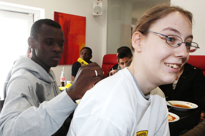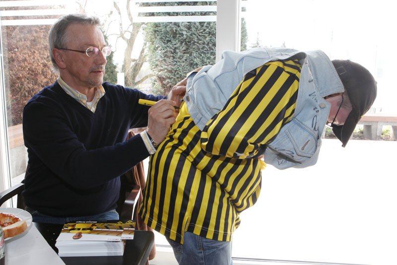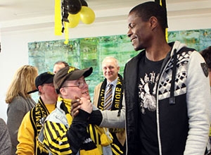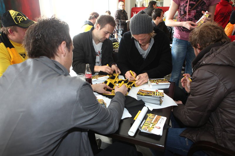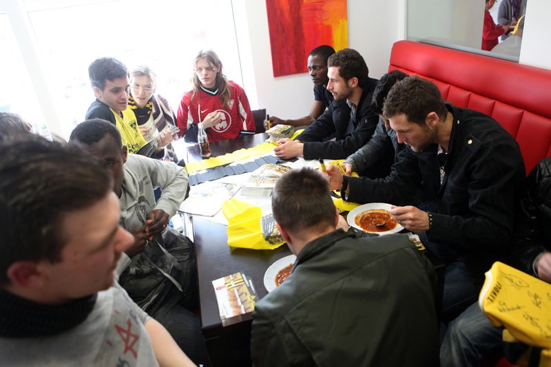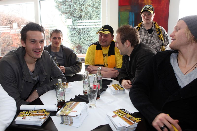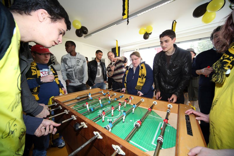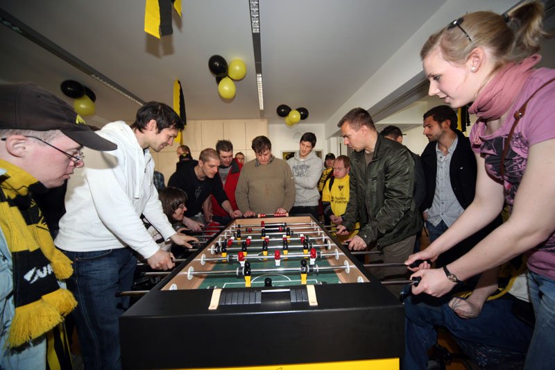 Natürlich hatten die Alemannen auch Gastgeschenke dabei – jede Menge schwarz-gelbe Utensilien, die jetzt das Lebenshilfe-Haus schmücken werden. Bereits seit September 2008 gehen Lebenshilfe Aachen und Alemannia im Rahmen einer Sozialpartnerschaft gemeinsam neue Wege, um Integration und soziales Lernen zu fördern. Dazu gehören regelmäßige Treffen und Aktionen, um das Miteinander von behinderten und nicht behinderten Menschen zu fördern. Genau diesem Zweck dient auch das Cafe Life, das täglich für Jedermann geöffnet ist.