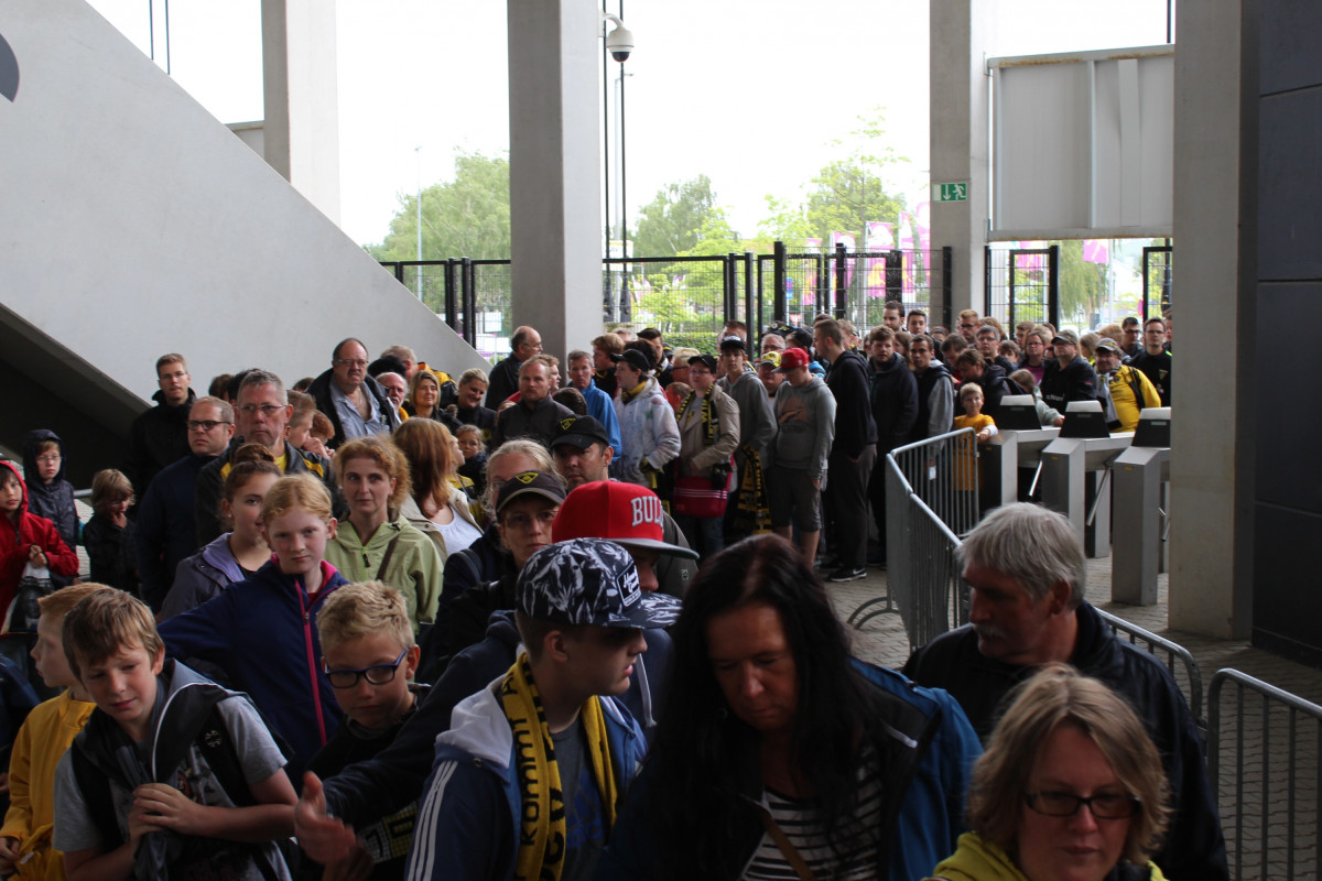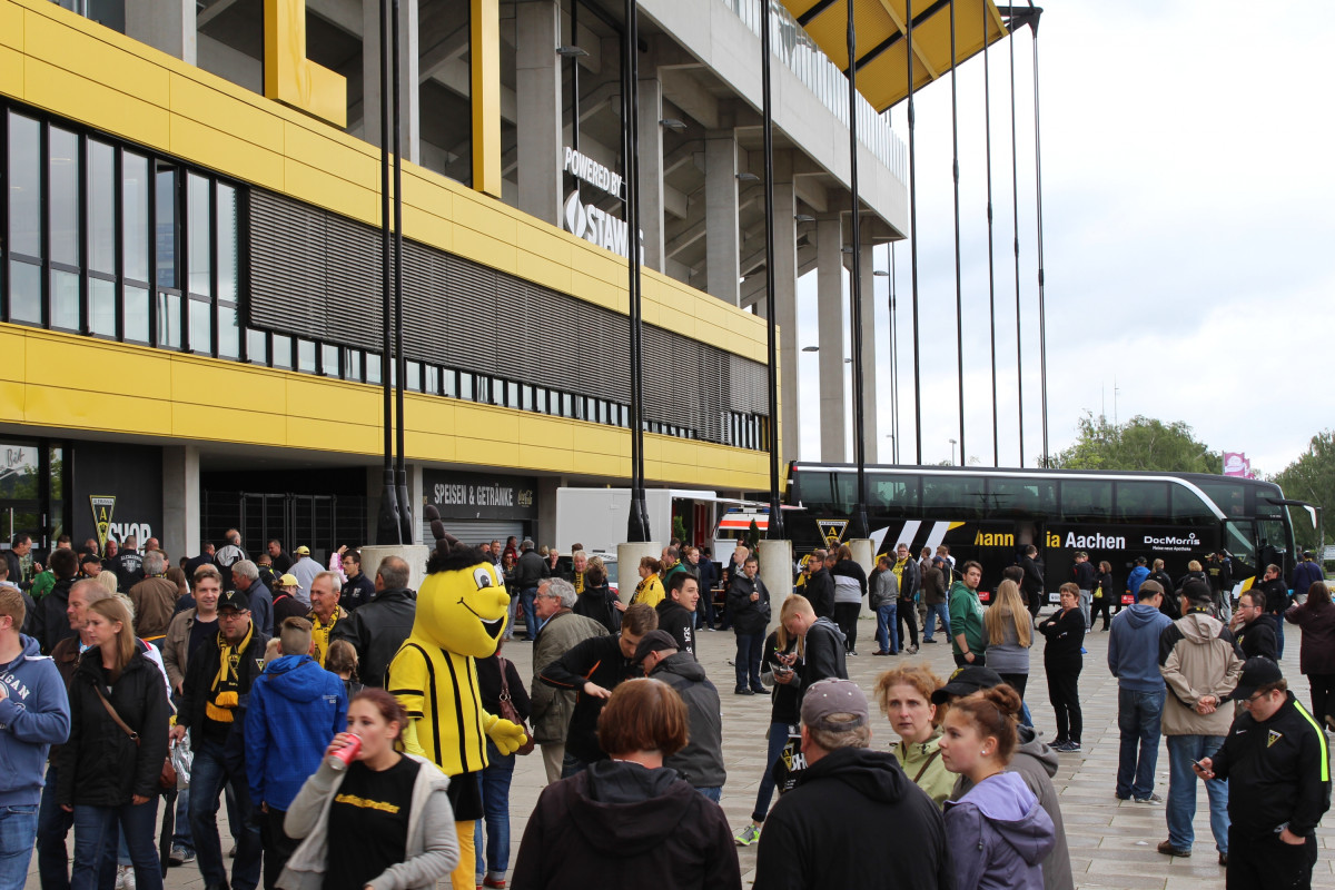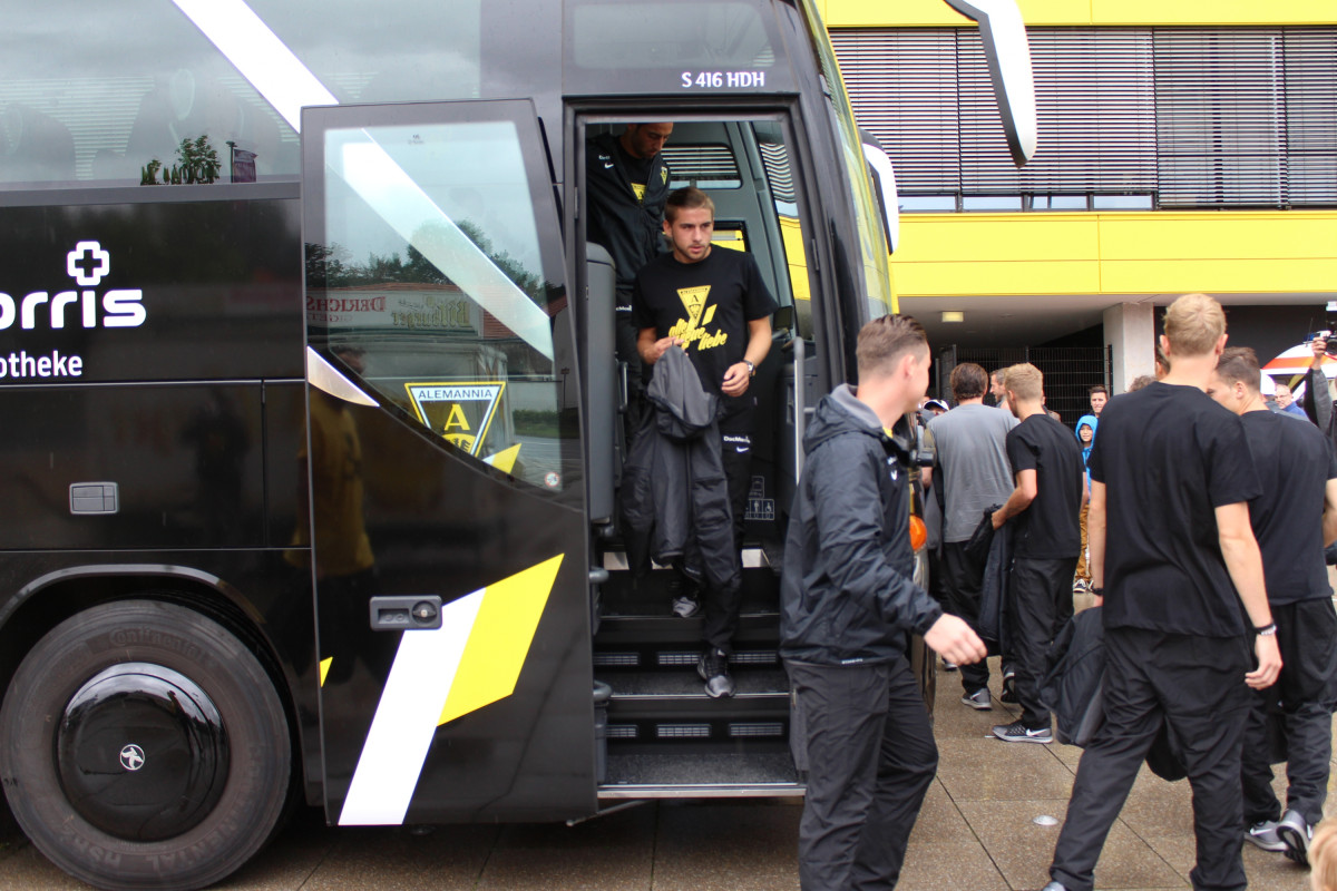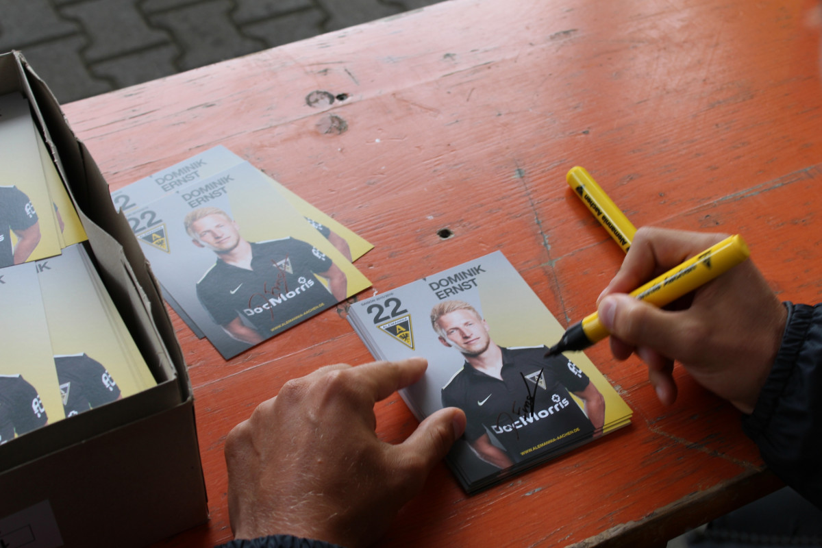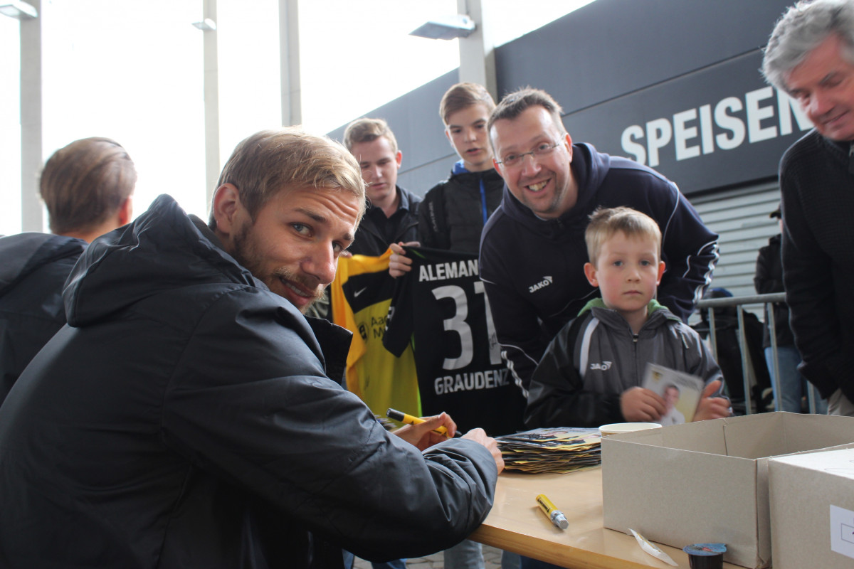 Der Wettergott meinte es am Samstag nicht gut mit der Alemannia. Tief „Zeljko“ zog über den Westen hinweg und sorgte für Regenschauer und orkanartige Stürme. Die Alemannia trotze den Witterungsbedingungen und feierte mit ihren Fans und Partnern rund um den Tivoli ihre große Saisoneröffnung. Das besondere Highlight war die Autogrammstunde mit dem gesamten schwarz-gelben Spielerkader.