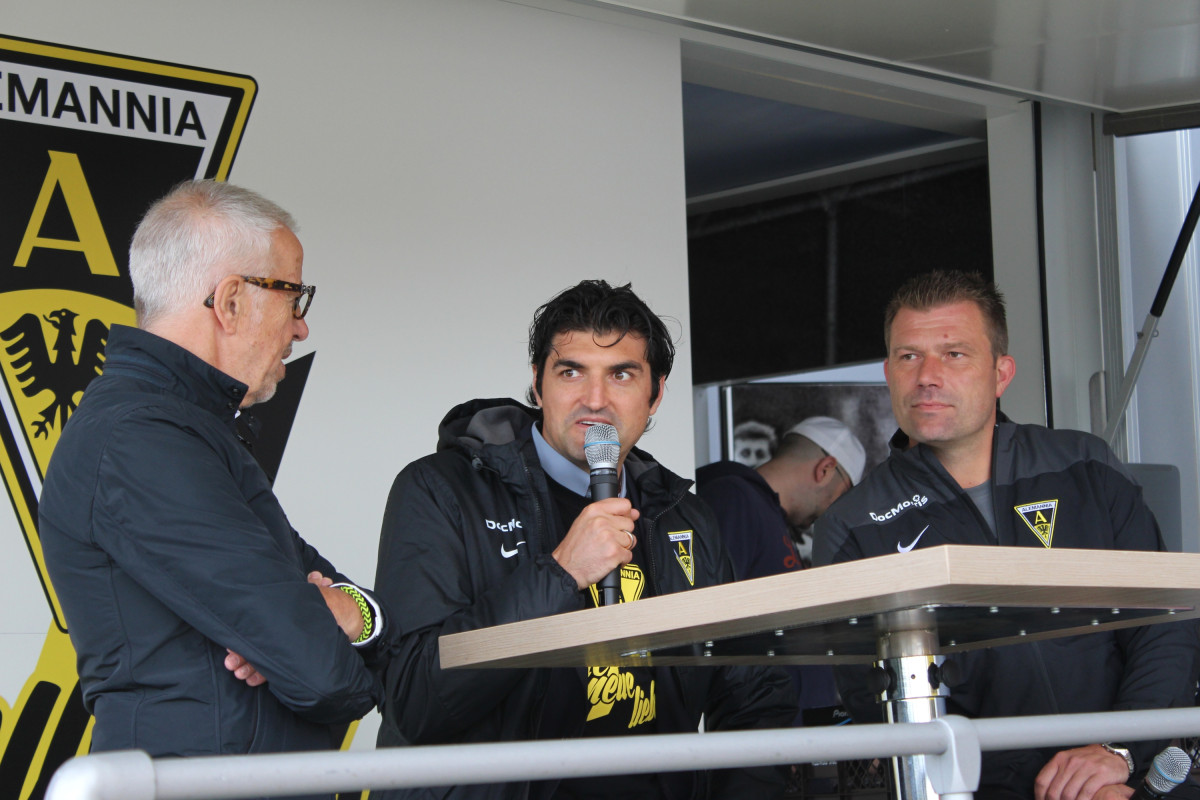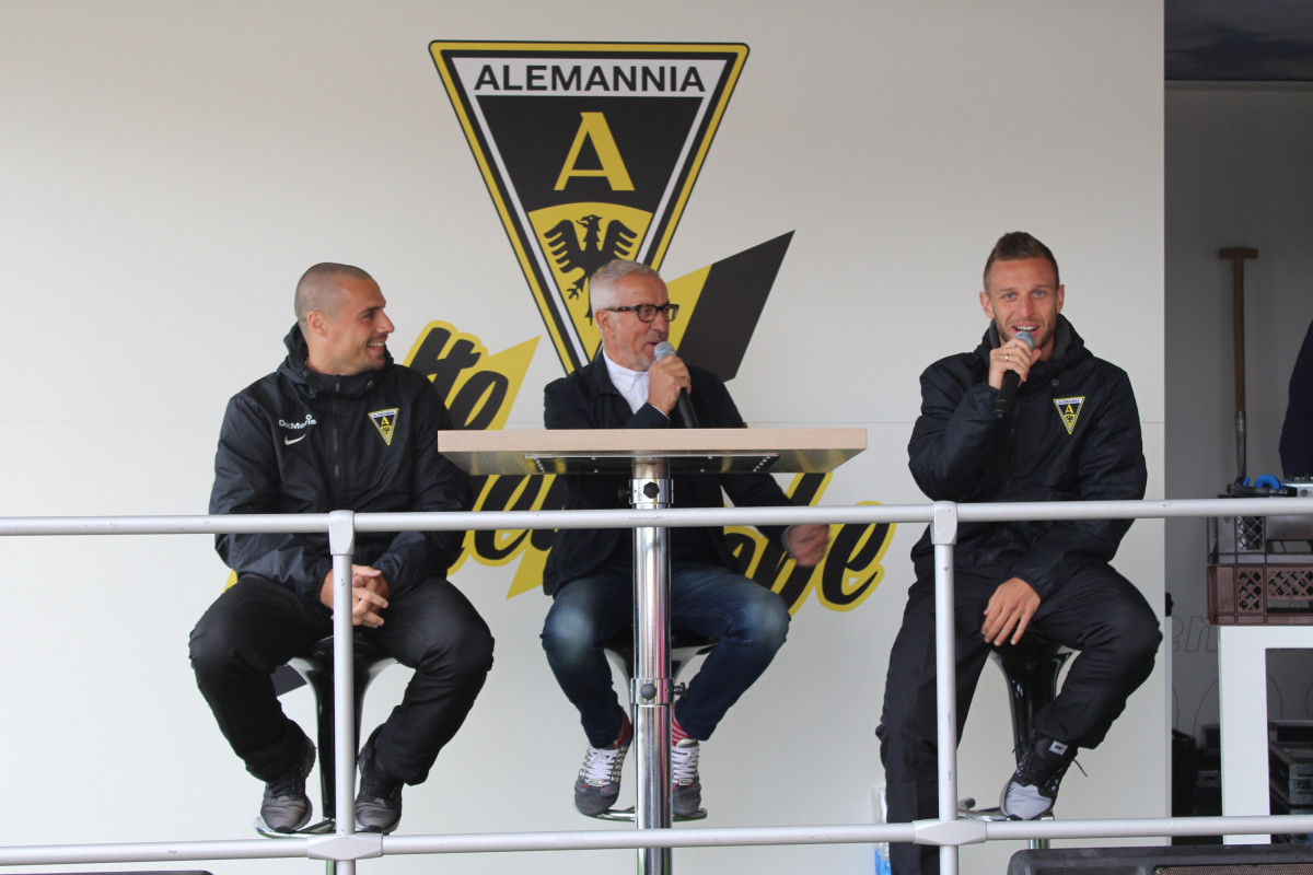 Auf der kleinen Bühne auf dem Vorplatz des Tivoli führte Stadionsprecher Robert Moonen durch das Programme. Das erste Thema war schnell gefunden: Die neue Kampagne „Alte Neue Liebe“. Gemeinsam mit Sportdirektor Alexander Klitzpera und Chefcoach Christian Benbennek stellte Moonen die Kampagne vor, die nicht nur bei den Fans auf großen Anklang stieß. „Ich kann mich total mit der Kampagne identifizieren. Ich bin erst ein paar Wochen in Aachen, deswegen wäre es vermessen, schon jetzt von Liebe zu sprechen. Aber ein bisschen verliebt bin ich schon“, sagte Benbennek mit einem Augenzwinkern.