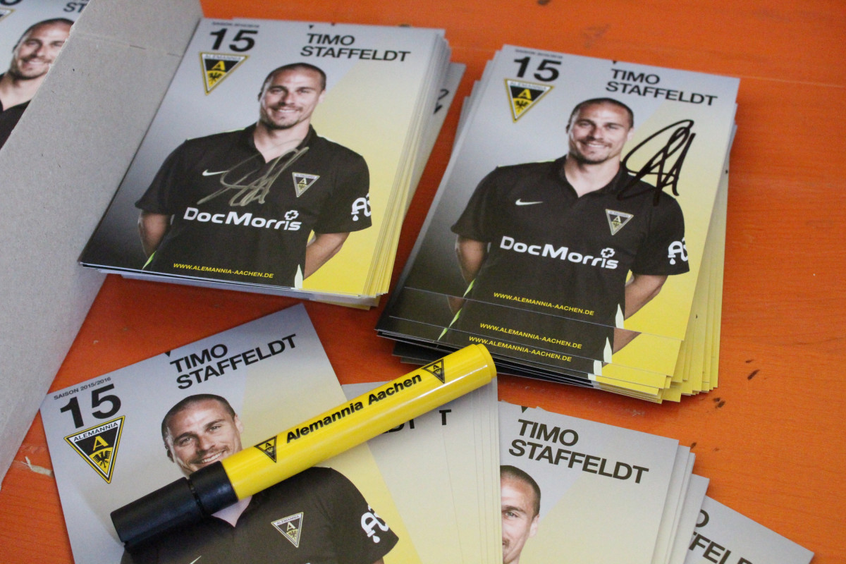 Auch auf den aktuellen Autogrammkarten der Tivoli-Kicker wurde der Slogan „Alte Neue Liebe“ aufgegriffen. Auf den Rückseiten der Karten findet sich zu jeden Spieler und Trainer ein Pendant aus der Alemannia-Historie. „Eine tolle Idee“, befand Benbennek. „Doch mein Rucksack ist ganz schön schwer.“ Dem aktuellen Cheftrainer wurde Klub-Legende Michel Pfeiffer zugeordnet.