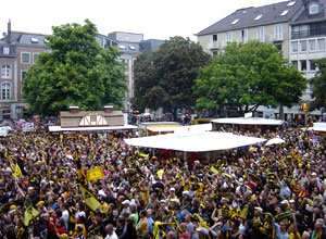Linden gestand, dass schon seit einigen Wochen still und leise über die mögliche Party gesprochen wurde. „Dass so schnell der Ernstfall eingetreten ist, freut uns um so mehr“, so der OB. „Wir laden alle Freunde und Fans der Alemannia herzlich dazu ein, mit uns auf dem Markt und in der ganzen Stadt zu feiern. Wir werden eine Aufstiegsparty feiern mit Talk, Musik und dem ein oder anderen Getränk“, sagte Linden bei einem Pressegespräch im Rathaus. Ab 16.30 Uhr wird die Mannschaft sich vom Tivoli ihren Weg durch die Stadt bahnen und soll gegen 18 Uhr auf der Rathaustreppe eintreffen.