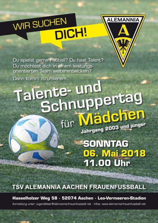 An zwei Tagen sucht die Frauen- und Mädchenfußballabteilung der Alemannia wieder nach jungen Talenten. In Aachen veranstalten die Schwarz-Gelben am Sonntag, 6. Mai, auf der Sportanlage am Hasselholzer Weg wieder ihren großen Talenttag. Los geht es ab 11 Uhr.