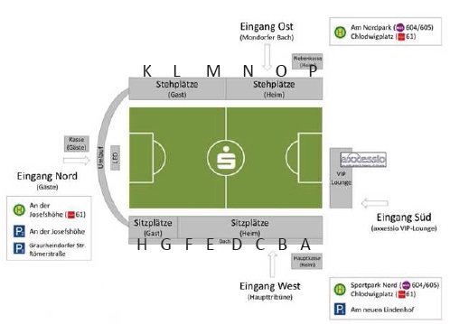 Für Alemannia-Fans sind die Blöcke G und H auf der Haupttribüne (nur Sitzplatz) sowie die Stehplatzblöcke K, L und M auf der Gegengeraden vorgesehen. Das vorläufige Kontingent besteht aus rund 2400 Steh- und 600 Sitzplätzen, bei Bedarf werden ggf. kurzfristig weitere Blöcke auf der Gegengeraden geöffnet.