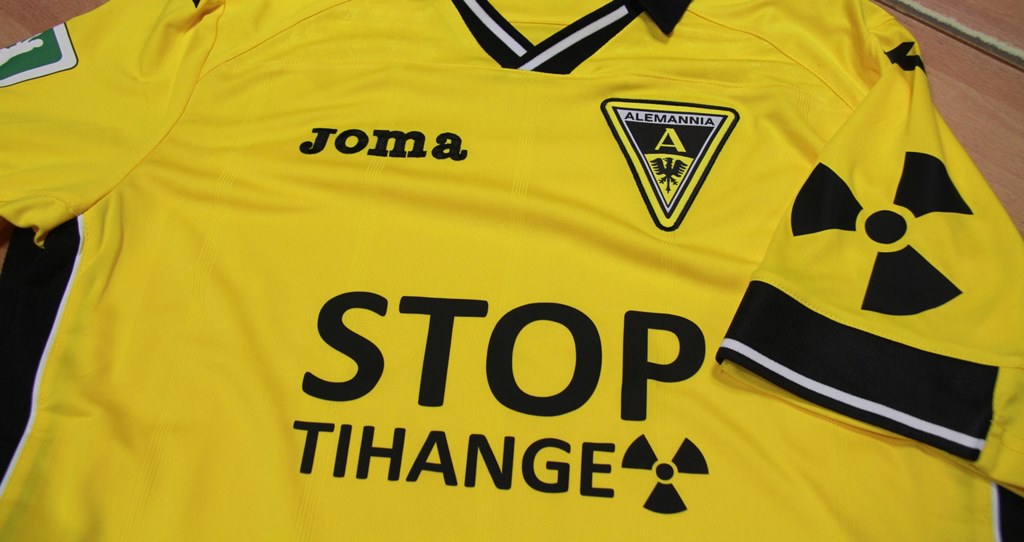 Zum Regionalligaspiel gegen Köln II läuft die Alemannia am Samstag vor über 20.000 Zuschauern mit Sondertrikots auf. „Stop Tihange“ seht auf den in limitierter Anzahl produzierten Hemden.