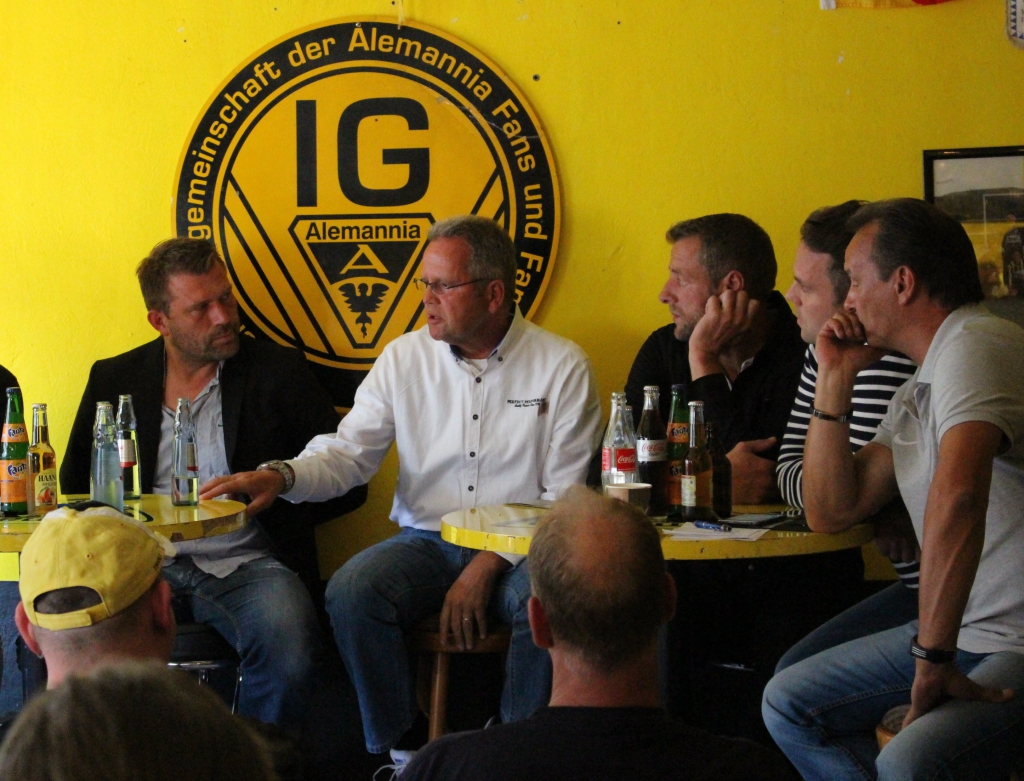 Nach der Einleitung durch die neue IG-Sprecherin Manina Kettler und Schatzmeister Jac Hirtz hieß es „Feuer frei“. Zahlreiche schwarz-gelbe Anhänger hatten den Weg in die Liebigstraße gefunden und durchlöcherten die Alemannia-Trainer mit ihren Fragen. Mehr als 90 Minuten plus Nachspielzeit nahmen sich die Coaches Zeit und standen den Fans Rede und Antwort.