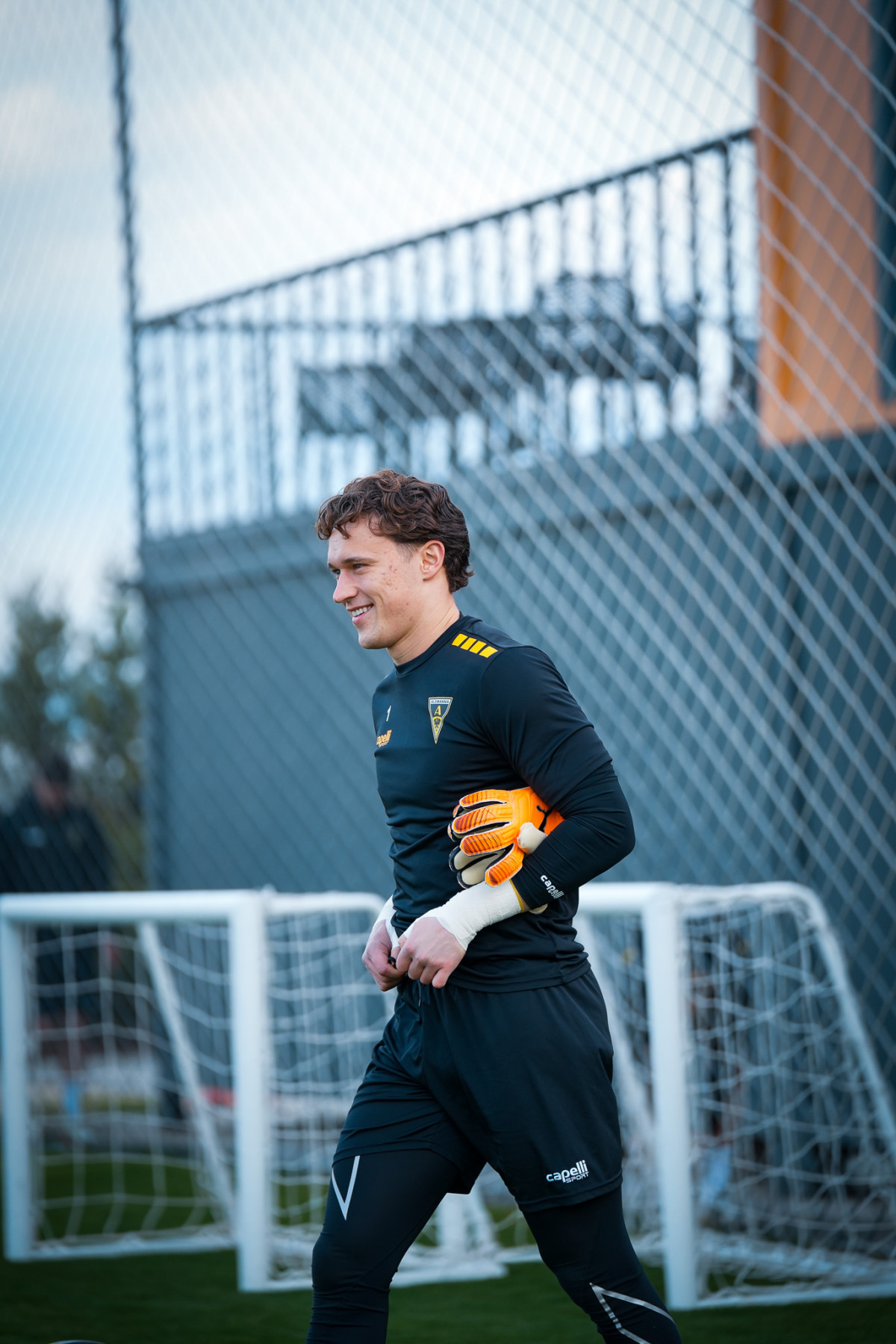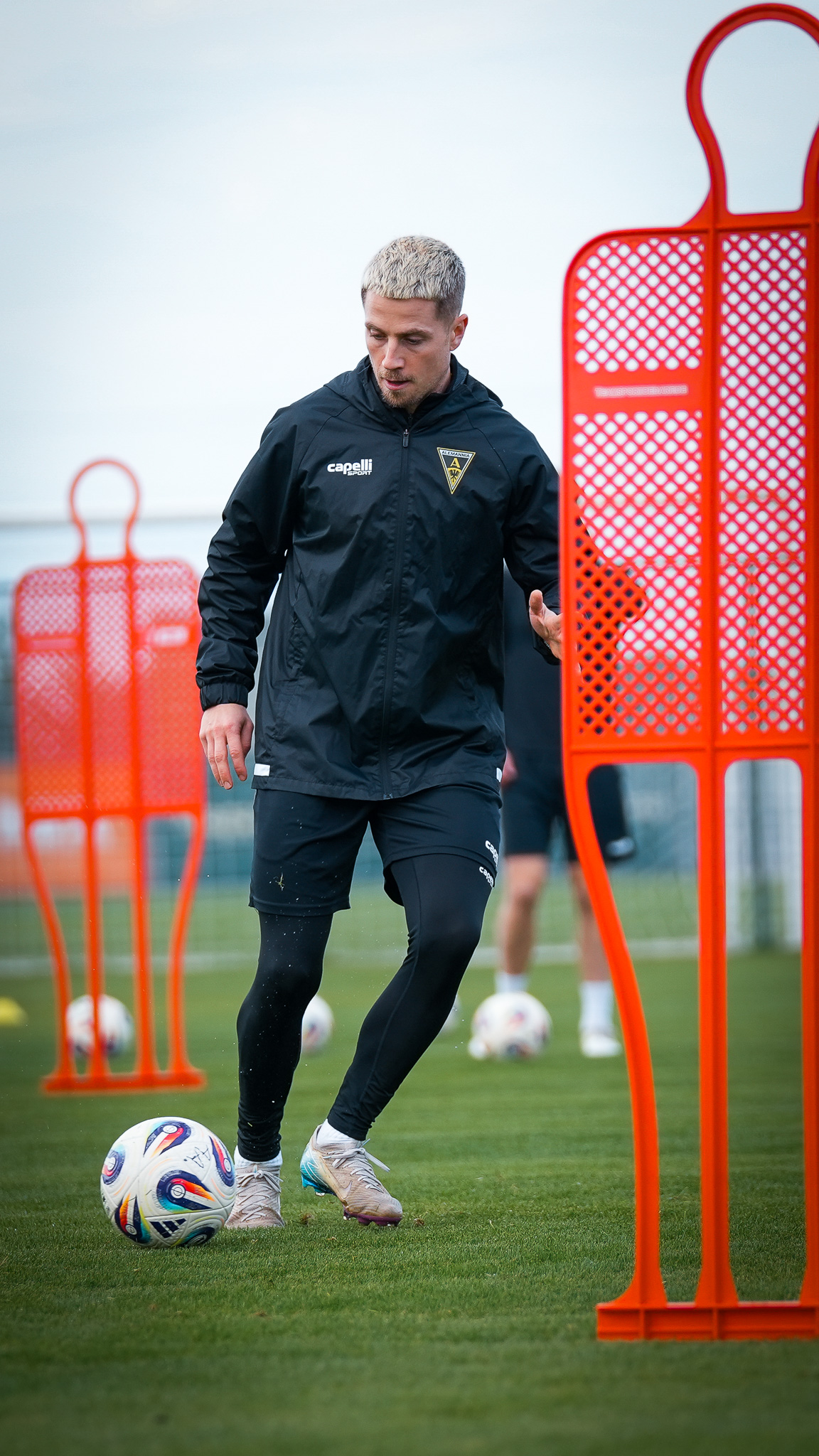 Während die Mannschaft in ihr Aufwärmprogramm startete, arbeitete Mika Hanraths gemeinsam mit dem Reha-Trainer weiter an seinem Comeback. Neben zahlreichen Stabilisierungsübungen stand dabei auch bereits das Training mit dem Ball auf dem Programm.