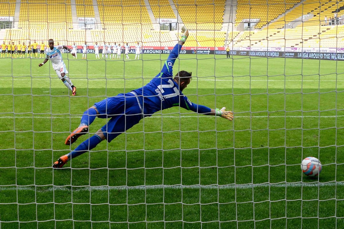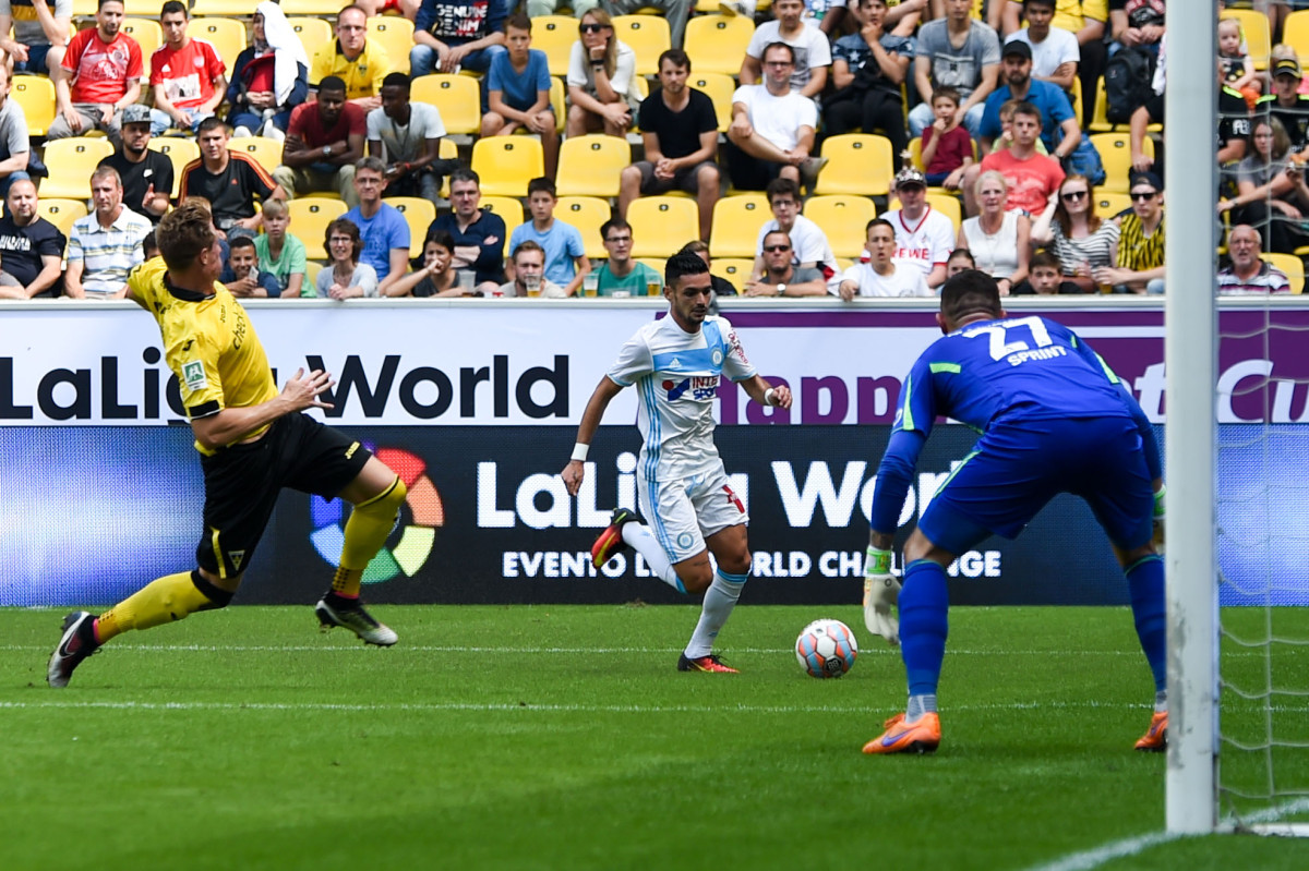 Im zweiten Duell traf die Alemannia auf den französischen Spitzenklub Olympique Marseille. Nach sieben Minuten hatte der Außenseiter gleich eine dicke Möglichkeit in Führung zu gehen. Gödde tauchte nach einem Ballverlust der Franzosen frei vor Keeper Samba auf, der das Duell Mann gegen Mann aber für sich entscheiden konnte. Nur eine Minute später konnte der OM-Schlussmann einen Kopfball von Propheter noch mit den Fingerspitzen entschärfen. Sein Gegenüber Philip Sprint musste in Minute 23 erstmals eingreifen, als er einen Schuss des frei gespielten Sarr über die Latte lenkte. Dann tauchten die Alemannen wieder gefährlich vor dem gegnerischen Gehäuse auf. Mickels scheiterte aus spitzem Winkel an Samba und im Nachsetzen brachten Fejzullahu und Suzuki die Kugel nicht im Netz unter (31.). Bedimo prüfte Sprint noch einmal mit einem wuchtigen Linkschuss (38.), ehe es nach torlosen 45 Minuten ins Elfmeterschießen ging. Hier behielten die Tivoli-Kicker gegen den Champions League-Sieger von 1992/1993 mit 4:2 die Oberhand. Den entscheidenden Elfer verwandelte Timo Staffeldt, nachdem sich der 9-fache französische Meister zuvor zwei Fehlschüsse geleitstet hatte.