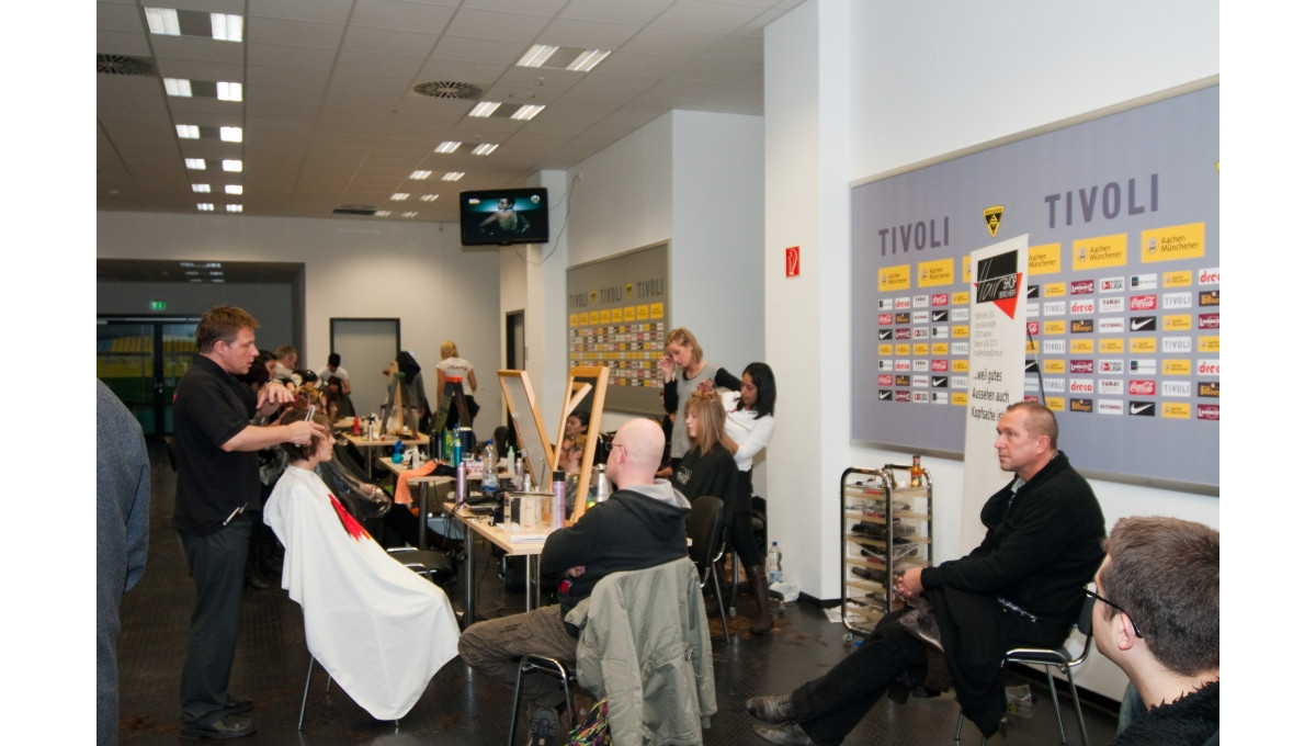 25 Frisöre aus Aachen und Umgebung starteten mit Unterstützung der Alemannia und 100,5 DAS HITRADIO am Sonntag, 7. Februar, den großen Charity-Frisörmarathon auf dem Tivoli zu Gunsten eines Kinderheims in Haiti. Von 8 bis 20 Uhr schnitten die Profis Haare für den guten Zweck. Zwölf Stunden pausenlos für nur 17 Euro. Die Alemannia stellte die Räumlichkeiten für die Charity-Aktion zur Verfügung.