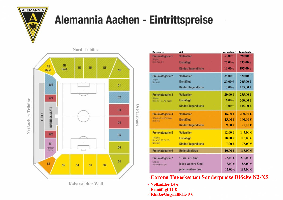 - Es gelten die in der Vorsaison gültigen Tageskassenpreise. Als sozialverträgliche Alternative zu den geschlossenen Stehplätzen gelten in den Blöcken N3 bis N5 vorübergehend vergünstigte Preise (14€ Vollzahler / 12€ ermäßigt / 9€ Jugendliche).