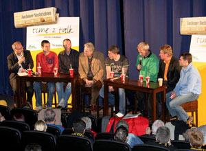 Die Moderatoren Achim Kaiser und Klaus Pastor begrüßten außerdem Jürgen Schmitz vom DSF. Der Reporter musste auch gleich zu den Protesten gegen die Montagsspiele Stellung nehmen. „Letztendlich entscheidet die DFL, wir vom DSF geben nur Wünsche vor. Wir hören die Kritik nicht gerne, das ist klar. Und am Ende trifft sie leider oft den Falschen“, sagte Schmitz. Dieter Hecking betonte die Zweischneidigkeit der Diskussion. Einerseits sei eine Häufung von langen Fahrten für die Fans natürlich nicht zumutbar. „Andererseits hat sich der Montagstermin etabliert. Das ist eine echte Werbung für die Zweite Liga.“ Jürgen Schmitz brachte es auf den Punkt: „Am Ende geht es auch beim neuen Fernsehvertrag darum, an welchen Terminen das meiste Geld zu verdienen ist.“ Und von diesem Geld profitieren dann natürlich wieder die Vereine.