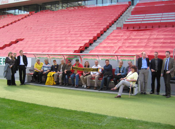 Stephan van der Kooi hat vor seiner Zeit bei der Alemannia den Bau des RheinEnergieStadions betreut und konnte dementsprechend fundierte und sehr qualifizierte Aussagen einerseits zum Stadion der Kölner, andererseits aber auch zum Neubau des Stadions in Aachen machen. Die Mitglieder folgten den Ausführungen höchst interessiert, da gerade der Vergleich der beiden Stadion für die Mitglieder von Bedeutung war. Den Weg der Spieler am Spieltag nachvollziehend, ging es durch die Tiefgarage in den Kabinentrakt, vom Aufwärmraum zum Spielertunnel und hinaus zum Spielfeldrand, wo alle auf der Auswechselbank Platz nehmen konnten und sich einmal wie ein richtiger Fußballer (oder Fußballerin) fühlen durften.