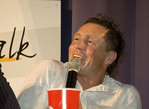 Aber auch Trainer Dieter Hecking und Vorstandsmitglied Karl-Theo Strepp waren zum Gespräch mit Klaus Pastor und Achim Kaiser von den Aachener Nachrichten gekommen. Doch so freundlich das Publikum die Gäste im Cinekarré auch empfing, so ernsthaft war das erste Thema des Abends. Willi Landgraf wurde nach seiner persönlichen Zukunft gefragt, bekanntlich liegt dem Rekordspieler ein Angebot von den Schalker Amateuren vor. „Die Alemannia ist mein Verein, ich liebe diesen Klub. Nach sieben Jahren mit dem Höhepunkt des Aufstieges muss ich mir jetzt überlegen, wie es weitergehen soll. Ganz ehrlich: Ich weiß es noch nicht, ich bin noch nicht mit mir im Reinen“, so der Sympathieträger.