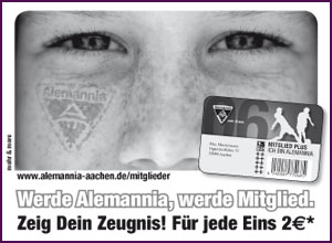 Für jede Eins auf Deinem aktuellen Sommerzeugnis reduziert sich der Beitrag für eine neue Alemannia-Plus-Mitgliedschaft 2006 um zwei Euro! Zeig einfach Dein Zeugnis am kommenden Freitag, 23. Juni, oder Samstag, 24. Juni, in einem der beiden Alemannia-Fanshops in der Pontstraße oder am Tivoli und Du erhälst bei Abschluss einer Plus-Mitgliedschaft diese bestenfalls für 2006 zum Nulltarif! Weitere Infos zur Alemannia-Plus-Mitgliedschaft findest du unter www.alemannia-aachen.de/mitglieder