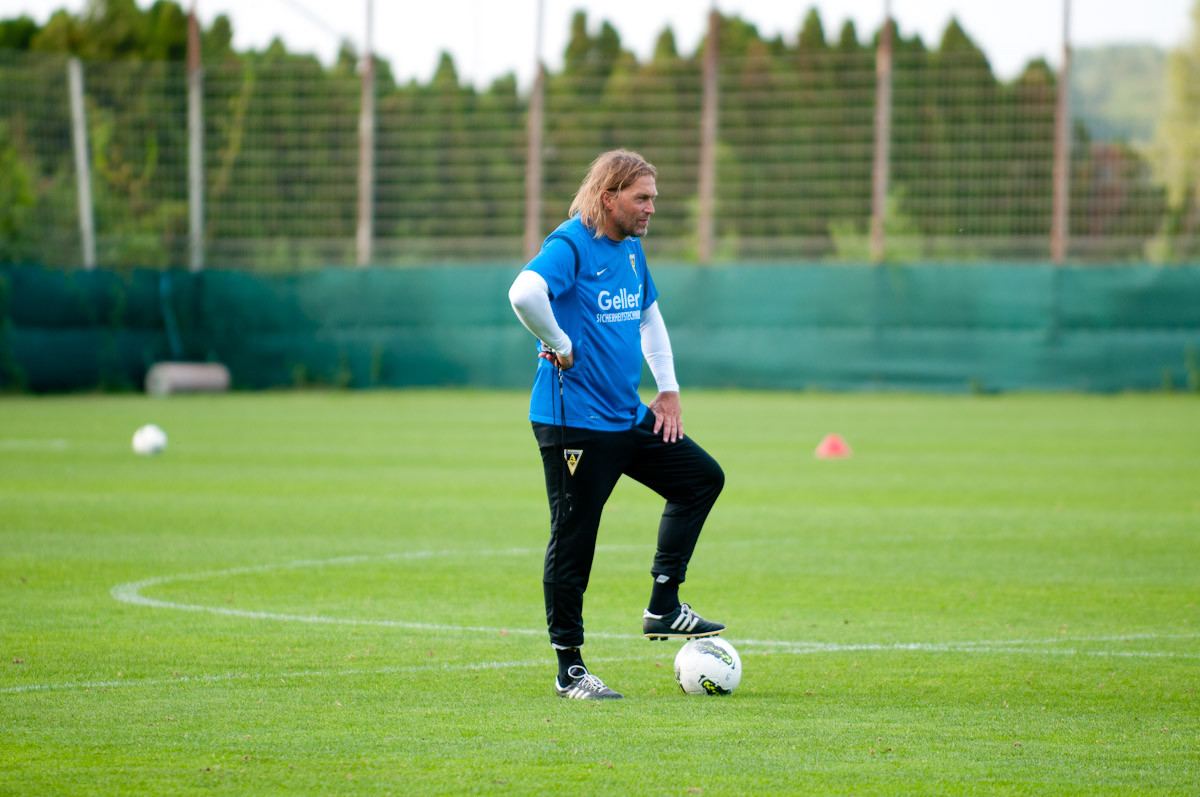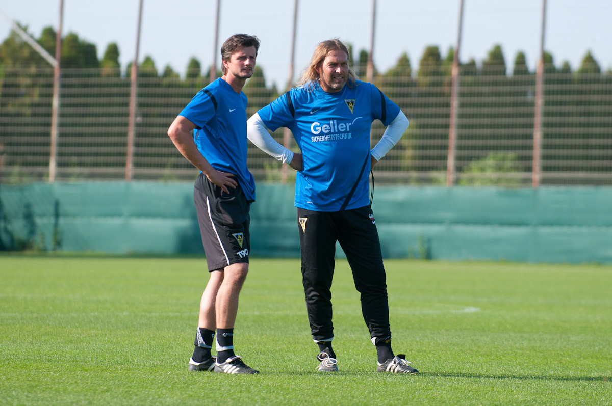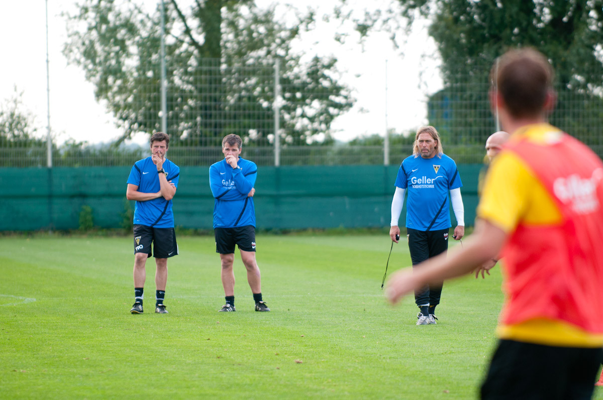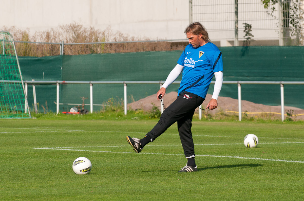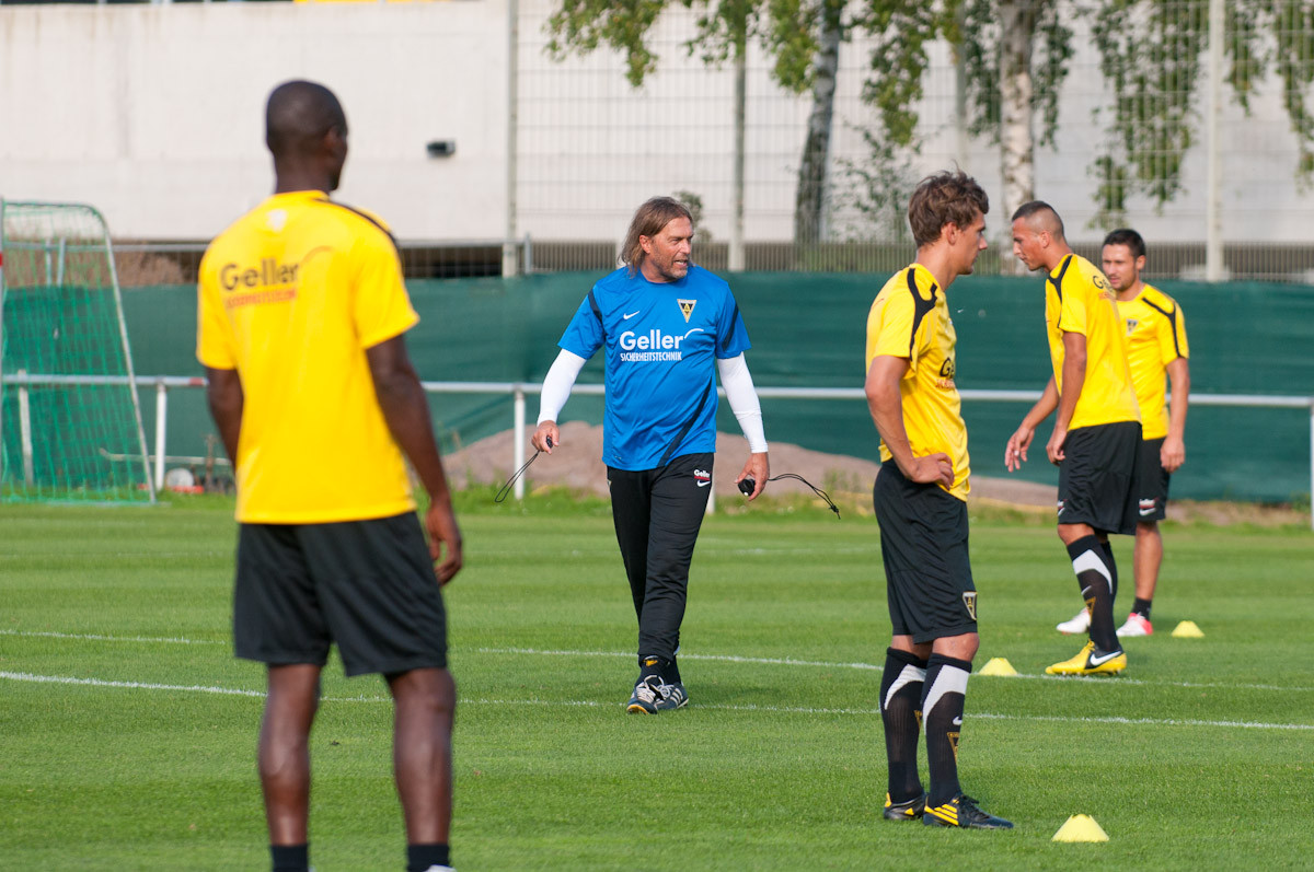 Einen ersten Eindruck von seiner Arbeit konnten sich im Anschluss an die offizielle Vorstellung rund 200 Zuschauer im Rahmen der ersten Trainingseinheit am späten Montagnachmittag machen. Zusammen mit Reiner Plaßhenrich, der interimsweise als Co-Trainer arbeitet, marschierte van Eck vorneweg, betrat als erster den Trainingsplatz und sorgte gleich für die erste äußerst lautstarke Einheit. Einzelne Passübungen standen auf dem Plan, immer wieder unterbrach van Eck das Training und teilte den Spielern mit lauten, klaren Ansprachen mit, was ihm nicht gefiel. „Ich lege sehr viel Wert darauf, dass das Zweikampfverhalten stimmt. Das ist im Spiel oft entscheidend“, so der Coach, der weiß wovon er spricht. Schließlich sammelte van Eck als Spieler unter anderem von 1998 bis 2000 im Trikot des 1. FC Nürnberg Erst- und Zweitligaerfahrungen. „Ich war ein robuster Innenverteidiger. Mein Zweikampfverhalten würde der Schiedsrichter heutzutage sicherlich unterbinden“, lacht van Eck.