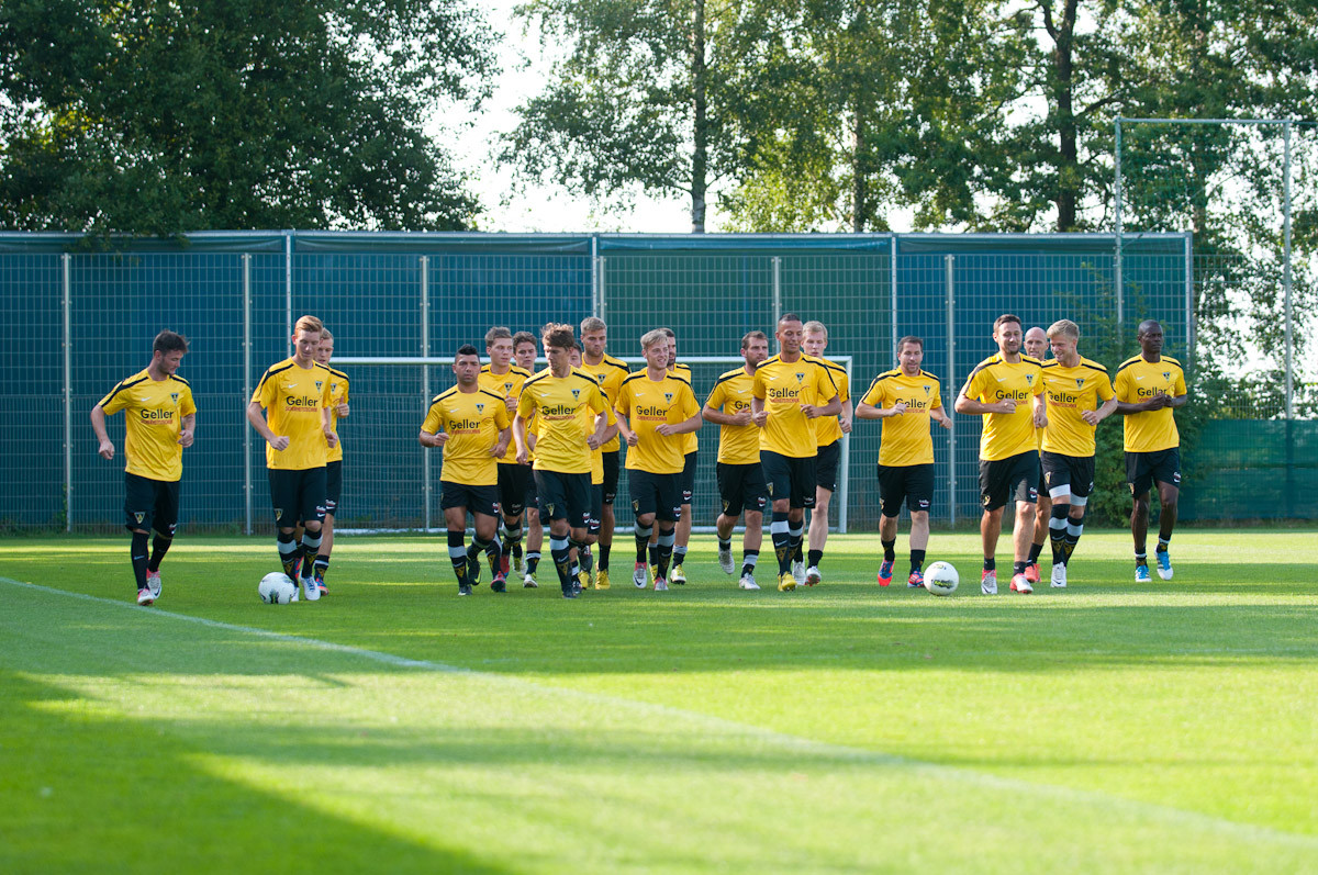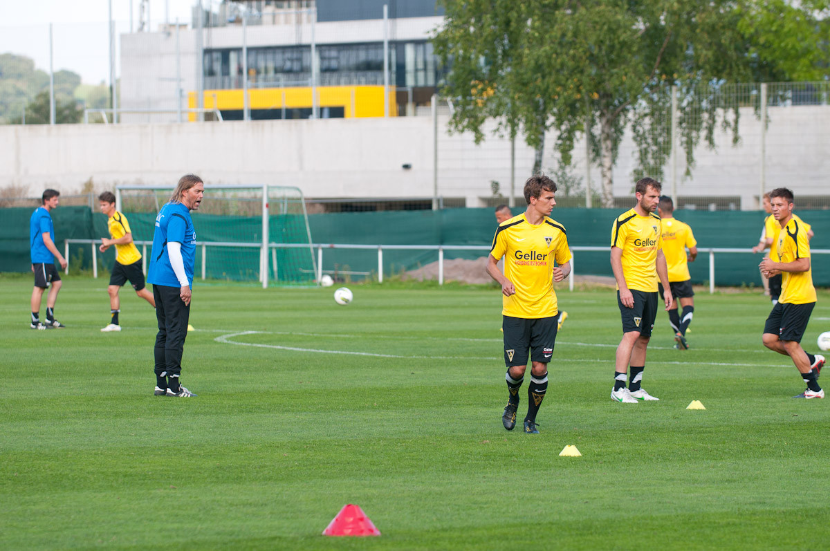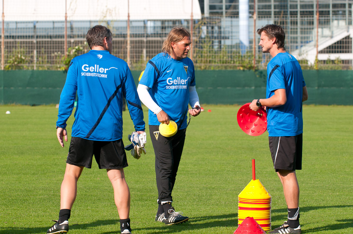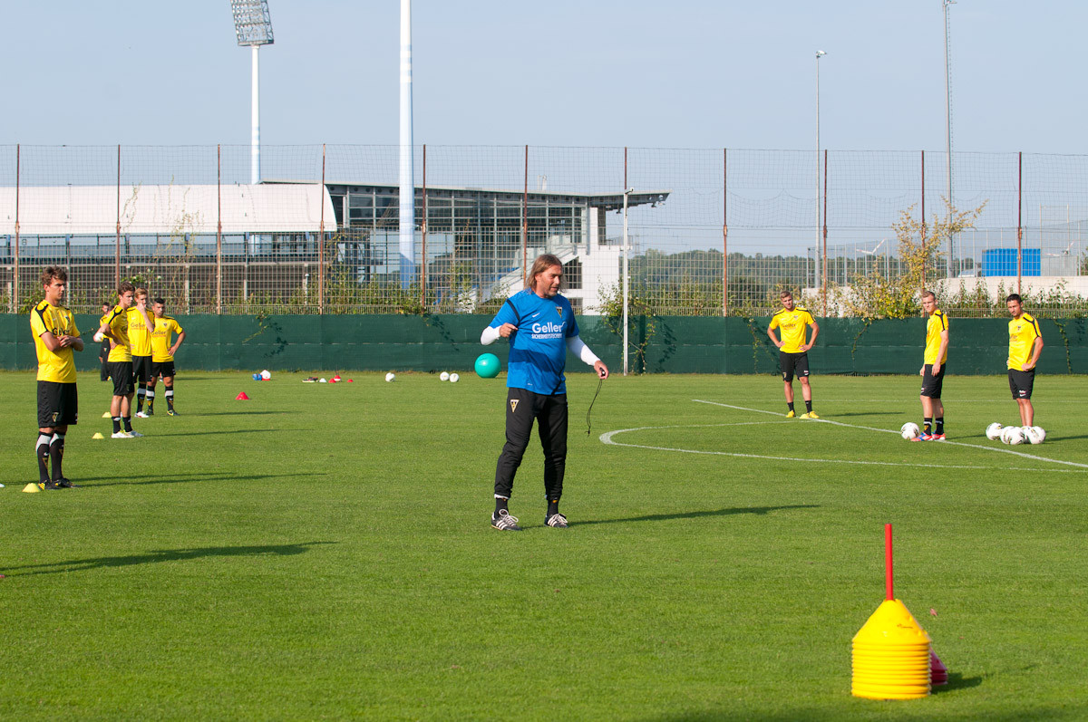 Einen ersten Eindruck von seiner Arbeit konnten sich im Anschluss an die offizielle Vorstellung rund 200 Zuschauer im Rahmen der ersten Trainingseinheit am späten Montagnachmittag machen. Zusammen mit Reiner Plaßhenrich, der interimsweise als Co-Trainer arbeitet, marschierte van Eck vorneweg, betrat als erster den Trainingsplatz und sorgte gleich für die erste äußerst lautstarke Einheit. Einzelne Passübungen standen auf dem Plan, immer wieder unterbrach van Eck das Training und teilte den Spielern mit lauten, klaren Ansprachen mit, was ihm nicht gefiel. „Ich lege sehr viel Wert darauf, dass das Zweikampfverhalten stimmt. Das ist im Spiel oft entscheidend“, so der Coach, der weiß wovon er spricht. Schließlich sammelte van Eck als Spieler unter anderem von 1998 bis 2000 im Trikot des 1. FC Nürnberg Erst- und Zweitligaerfahrungen. „Ich war ein robuster Innenverteidiger. Mein Zweikampfverhalten würde der Schiedsrichter heutzutage sicherlich unterbinden“, lacht van Eck.