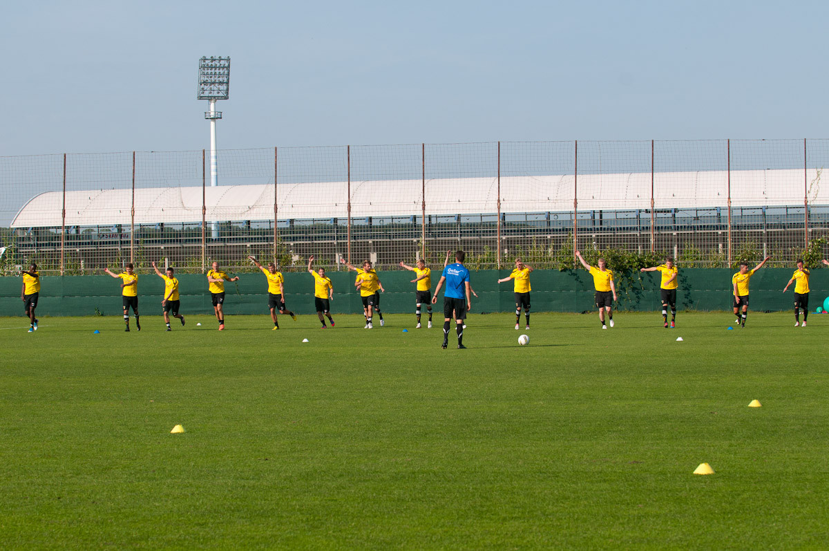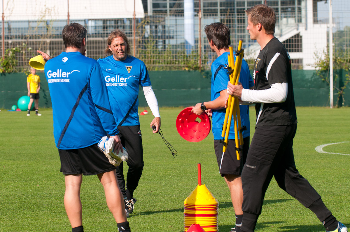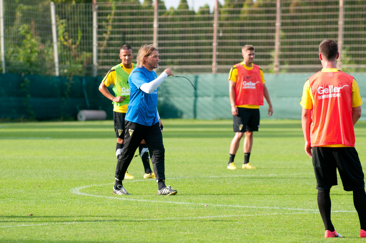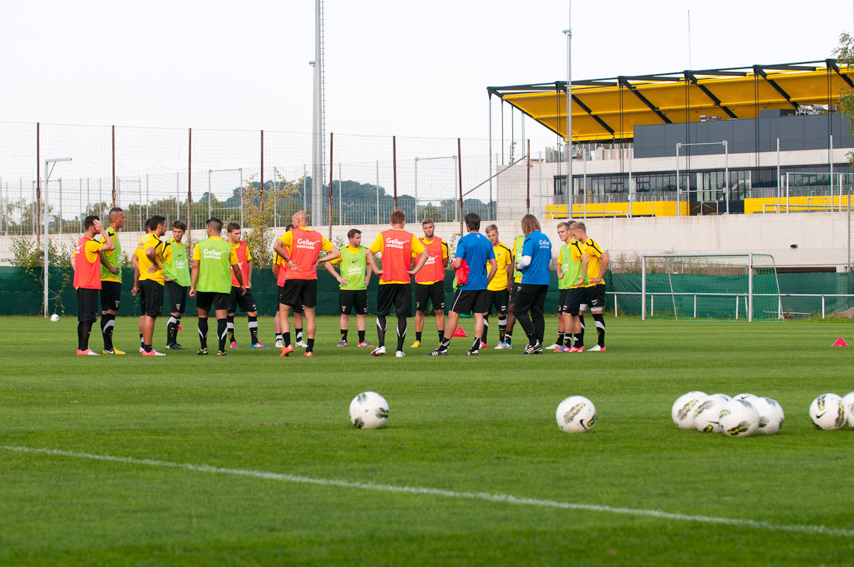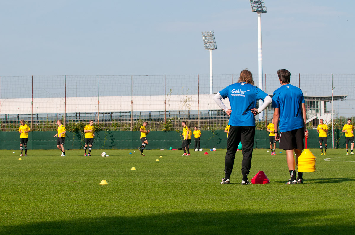 Einen ersten Eindruck von seiner Arbeit konnten sich im Anschluss an die offizielle Vorstellung rund 200 Zuschauer im Rahmen der ersten Trainingseinheit am späten Montagnachmittag machen. Zusammen mit Reiner Plaßhenrich, der interimsweise als Co-Trainer arbeitet, marschierte van Eck vorneweg, betrat als erster den Trainingsplatz und sorgte gleich für die erste äußerst lautstarke Einheit. Einzelne Passübungen standen auf dem Plan, immer wieder unterbrach van Eck das Training und teilte den Spielern mit lauten, klaren Ansprachen mit, was ihm nicht gefiel. „Ich lege sehr viel Wert darauf, dass das Zweikampfverhalten stimmt. Das ist im Spiel oft entscheidend“, so der Coach, der weiß wovon er spricht. Schließlich sammelte van Eck als Spieler unter anderem von 1998 bis 2000 im Trikot des 1. FC Nürnberg Erst- und Zweitligaerfahrungen. „Ich war ein robuster Innenverteidiger. Mein Zweikampfverhalten würde der Schiedsrichter heutzutage sicherlich unterbinden“, lacht van Eck.