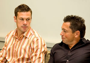 „Wir sind in den drei gemeinsamen Jahren bei der Alemannia dicke Freunde geworden. Also haben wir irgendwann angefangen, unseren Abschied gemeinsam zu planen“, sagt der 37-jährige Meijer. „Bei unserem letzten Heimspiel im Mai gegen Freiburg hat das auch schon sehr gut funktioniert“, fügt Landgraf hinzu, der Ende des Monats 38 Jahre alt wird. Mit welchen Stars darf also am 8. Oktober gerechnet werden? „Erik hat Ulf Kirsten und Sergej Barbarez eingeladen, ich halte den Schauspieler Mark Keller und Horst Hrubesch dagegen“, scherzt Landgraf.