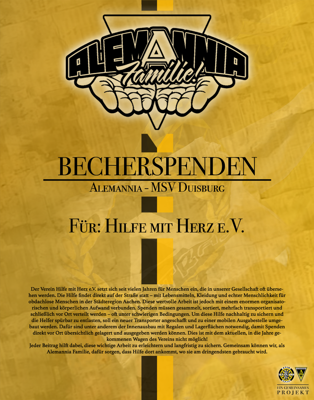 Beim Heimspiel gegen den MSV Duisburg haben die Fans erneut die Möglichkeit, ihren Becherpfand für Hilfe mit Herz e.V. zu spenden. Bereits beim letzten Heimspiel konnten Spenden für den Verein gesammelt werden.