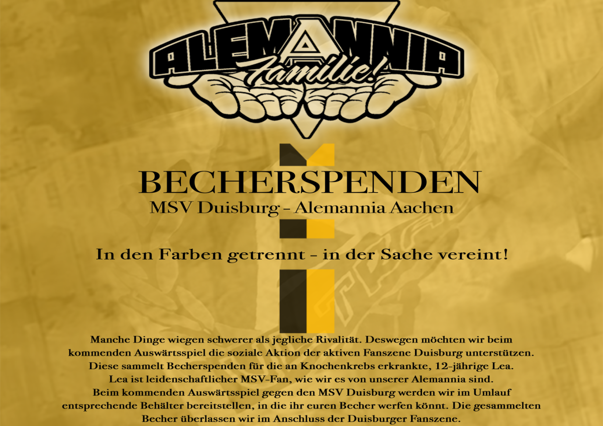 Am Samstag gastiert die Alemannia beim MSV Duisburg im Rahmen des 16. Spieltages der 3. Liga. Ähnlich wie bei Heimspielen auf dem Tivoli werden Aachenerinnen und Aachener auch in Duisburg die Möglichkeit haben, ihren Becherpfand zu spenden.