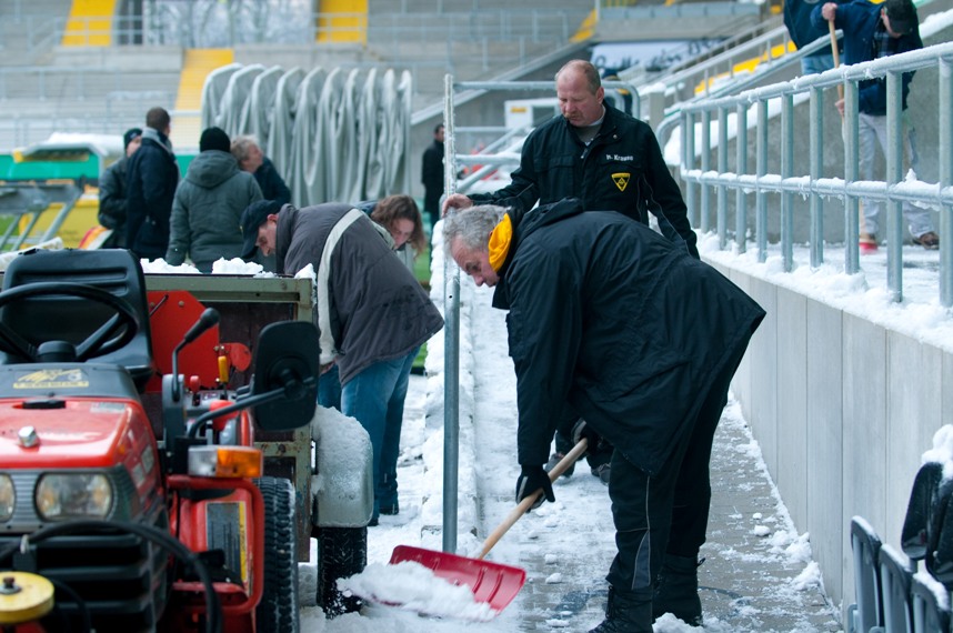 Dank des tollen Einsatzes hilfsbereiter Alemannia-Fans wurden am Freitag Innenraum und Tribünen des Tivoli vom Schnee befreit, um das Stadion für das große Spiel gegen den FC Bayern vorzubereiten.