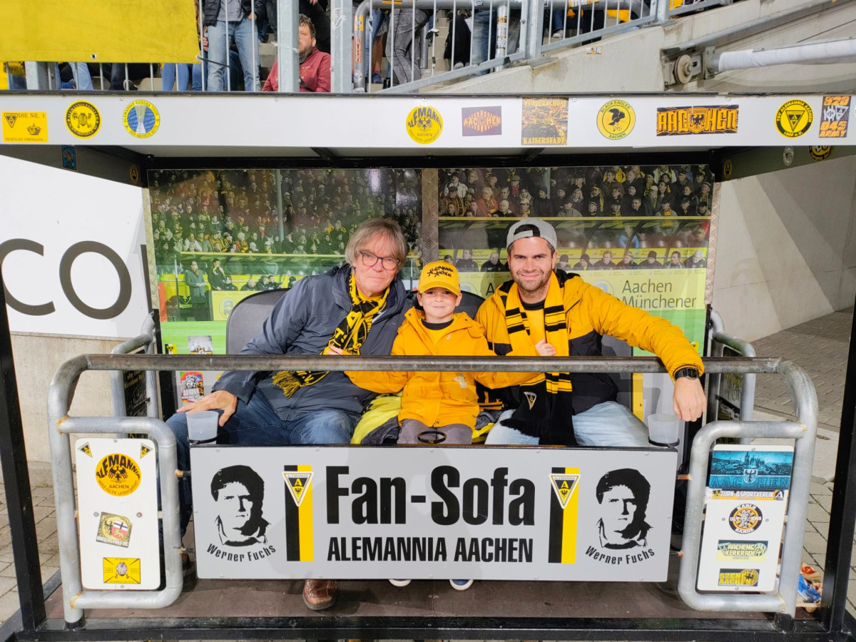Beim letzten Heimspiel auf dem Tivoli durften der sechsjährige Theo, sein Vater Niklas und sein Großvater Engelbert das Spiel der Alemannia aus nächster Nähe vom Fansofa aus verfolgen – direkt am Spielfeldrand.