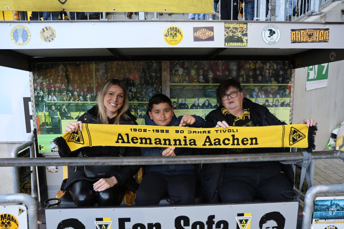 Beim Heimspiel gegen den SV Wehen Wiesbaden nahm mit Birgit eine echte Alemannia-Anhängerin auf dem Fansofa Platz. Sie wurde begleitet von ihrer Tochter Ramona und ihrem Enkel Elyas.