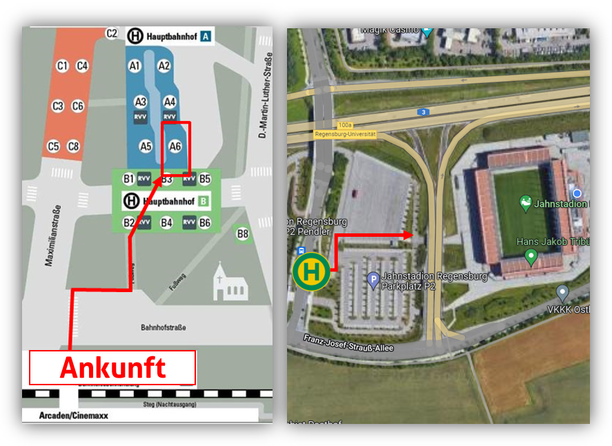 Jahnstadion Regensburg. Gästefans können nach Absprache mit dem Busfahrer im Anschluss an die Haltestelle für Heimfans an der Behelfshaltestelle ‚Galgenbergstr.‘ aussteigen und von dort zum