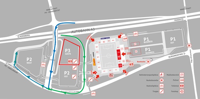 Bei Einfahrt auf die Straße zu P3 bitte auf der linken Spur halten, da auf der rechten Spur vor allem die Fans für P2 einfahren. Sollte der Gästeparkplatz P3 voll sein, besteht die Möglichkeit auf den Parkplatz 5 auszuweichen. Dieser ist etwas weiter entfernt vom Stadion am Uniklinikum Regensburg.