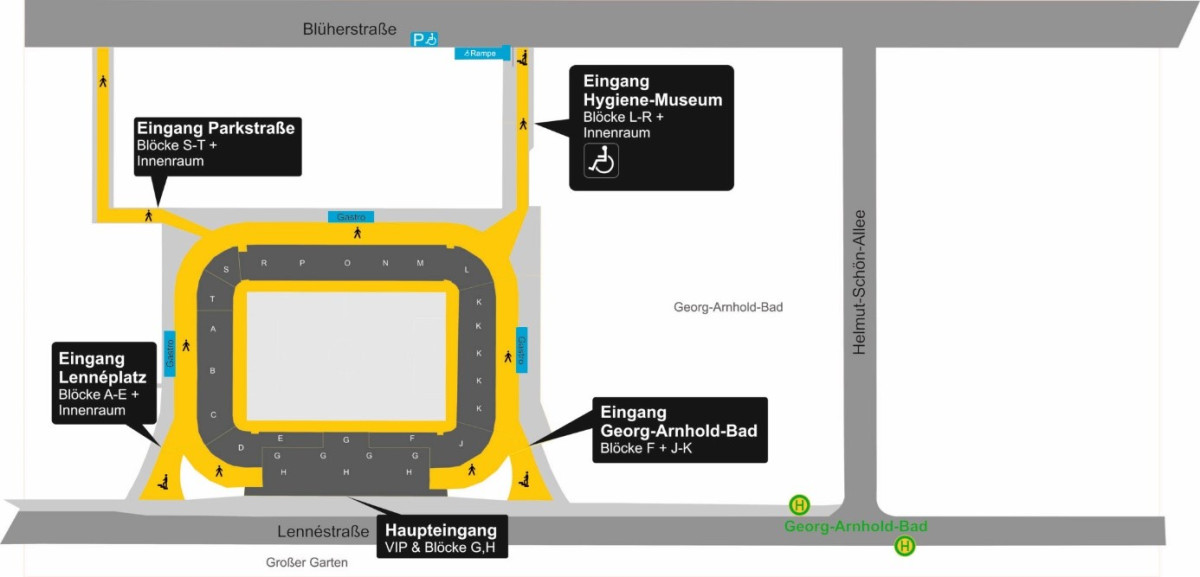 Vom Parkplatz zum Stadion und zurück werden kostenlose Shuttlebusse eingesetzt. Dynamo bittet unbedingt die Anreiseempfehlung zu beachten, um die Sicherheit der Fahrzeuge zu gewährleisten.
