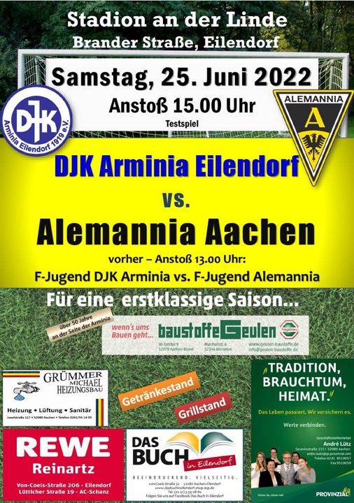 Am Samstag, 25.6., bestreitet die Alemannia das erste Vorbereitungsspiel der Saison 2022/23 bei der DJK Arminia Eilendorf. Das Spiel wird um 15 Uhr im Stadion an der Linde an der Brander Straße in Aachen-Eilendorf angestoßen.