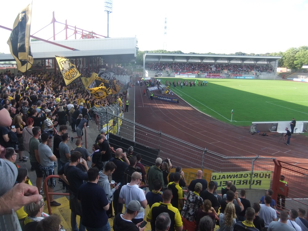 Erlaubt sind Zaunfahnen, Schwenkfahnen, Trommeln (einseitig offen) sowie ein Megaphon. Zaunfahnen müssen von der Laufbahn aus am Zaun befestigt werden und dürfen nicht mit in den Block genommen werden. Nicht erlaubt sind Taschen und Rucksäcke, es besteht keine Abgabemöglichkeit.