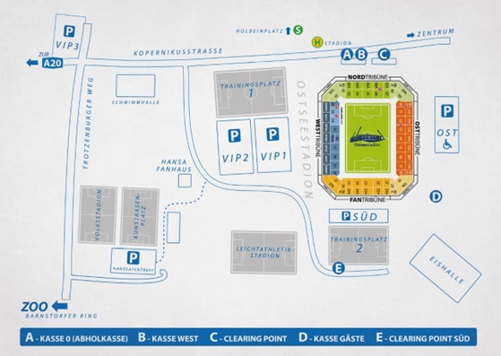 Seit 1965 trägt der FC Hansa Rostock seine Heimspiele im 1954 eröffneten Ostseestadion aus. Im Jahr 2001 wurde der Umbau des Stadions abgeschlossen. Die Kapazität der Spielstätte beträgt 29.000 Plätze, darunter befinden sich 20.000 Sitzplätze und 9.000 Stehplätze. Die Gästeblöcke 19, 19A, 20 und 20A liegen in der Südostecke des Stadions.