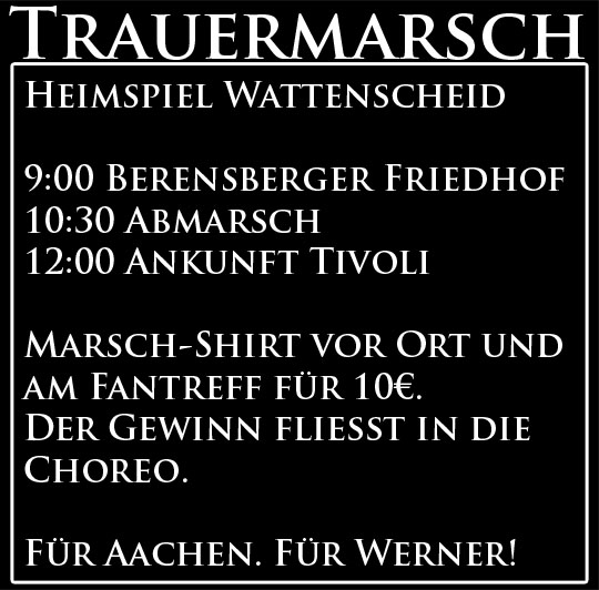 Am 11. Mai jährte sich zum 15. Mal der Todestag von Werner Fuchs. Zum Gedenken an den Aufstiegstrainer haben Fanklubs der Alemannia zum Heimspiel gegen Wattenscheid (17.5.) unter anderem einen Trauermarsch vom Friedhof zum Tivoli geplant.