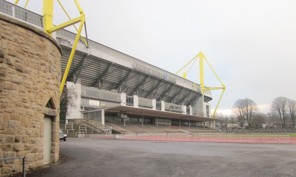 Das Dortmunder Westfalenstadion (seit 2005 "Signal Iduna Park") wurde 1974 direkt hinter der Haupttribüne der traditionsreichen Kampfbahn Rote Erde eröffnet. Bei Drittligaspielen weicht die Borussia gelegentlich vom Stadion Rote Erde in den Signal Iduna Park aus. Das Stadion fasst bei Bundesligaspielen 80.645 Zuschauer. Für Alemannia-Fans sind die Blöcke 61 (Stehplatz) sowie 62 (Sitzplatz) auf der Nordtribüne geöffnet. Kassen und Eingang befinden sich in der Strobelallee hinter der Nordtribüne. Das Stadion öffnet um 17:30 Uhr.