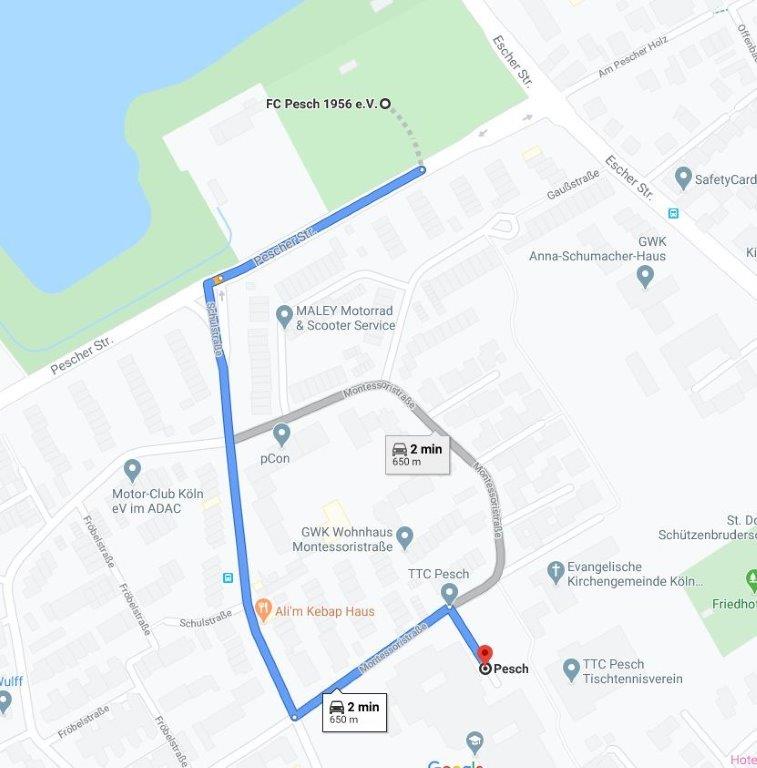 Karteninhaber können den Parkplatz des Gymnasiums, Schulstraße 18, 50767 Köln-Pesch nutzen, alternativ den Parkplatz des Lidl, Donatusstraße 20. Der Sportplatz liegt ca. 650 Meter entfernt an der Pescher Straße.