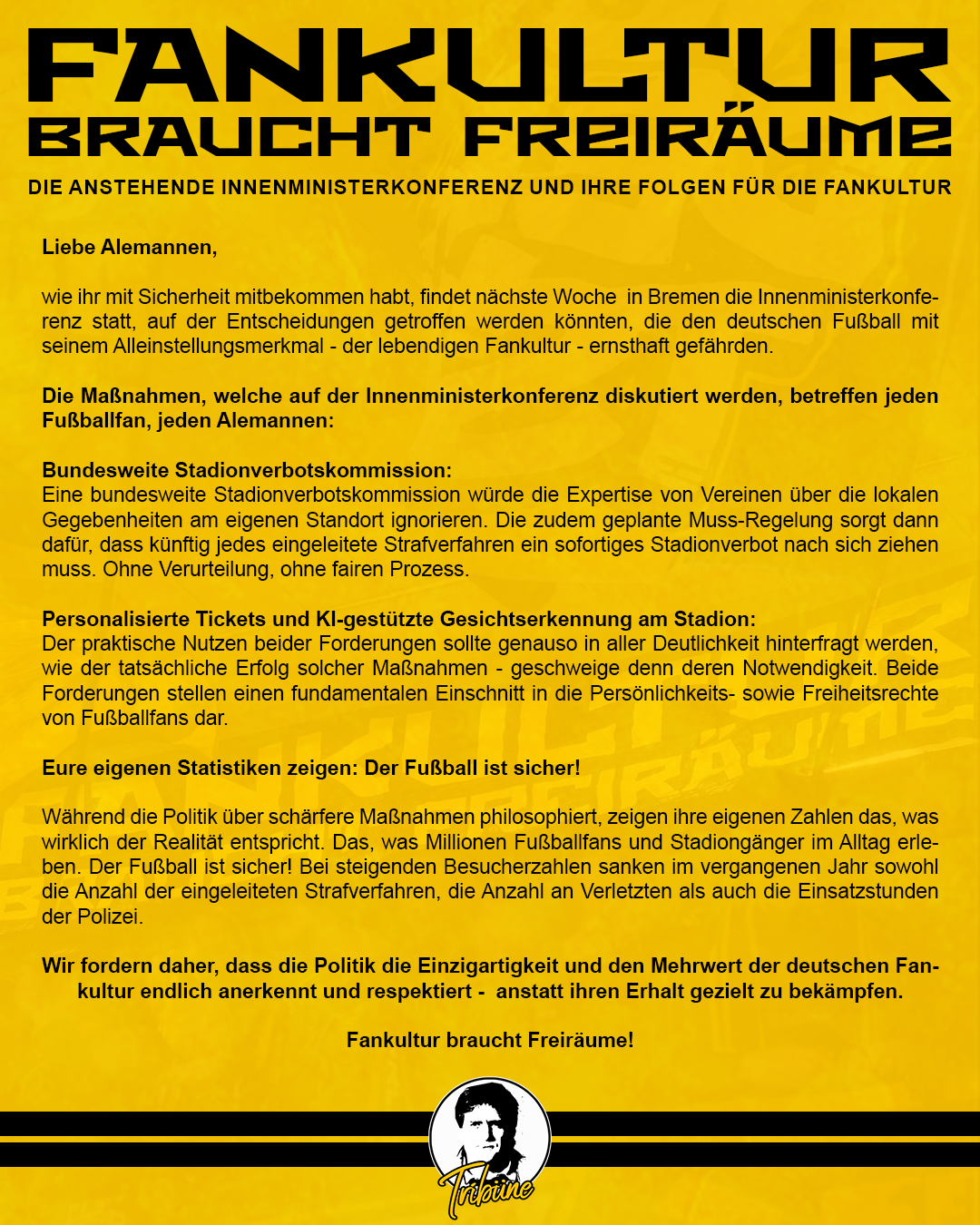 Aus diesem Grund appellieren wir an die Verantwortlichen der Innenministerkonferenz, die geplanten Schritte gemeinsam mit den Verbänden, den Vereinen und den Fanvertretungen weiterzuentwickeln. Nur durch eine sachliche, partnerschaftliche Diskussion lassen sich Lösungen finden, die Sicherheit und Fankultur gleichermaßen schützen.