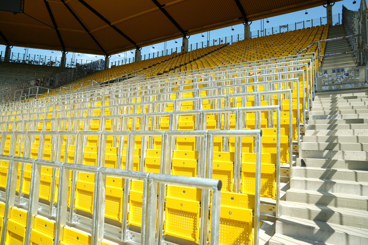 Diese Sitze bieten gleich mehrere Vorteile: Im hochgeklappten Zustand fungieren sie als integrierte Sicherheitsbarriere, wodurch das Gedränge verringert und die Zuschauersicherheit deutlich erhöht wird. Gleichzeitig lassen sie sich bei Bedarf herunterklappen und als vollwertige Sitzplätze nutzen.