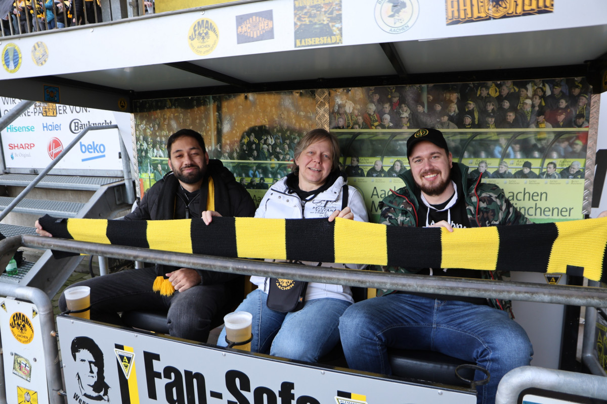 Mit dem Platz auf dem Fansofa wollte sich der Sohn bei seiner Mutter bedanken – für eine fürsorgliche Kindheit, für ihren unermüdlichen Einsatz mit einigen Schicksalsschlägen in den letzten Jahren und dafür, dass sie ihn zu dem gemacht hat, was er heute ist: ein echter Alemannia-Fan. Zudem wurden die beiden noch durch ihren gemeinsamen Bekannten Dominik begleitet.