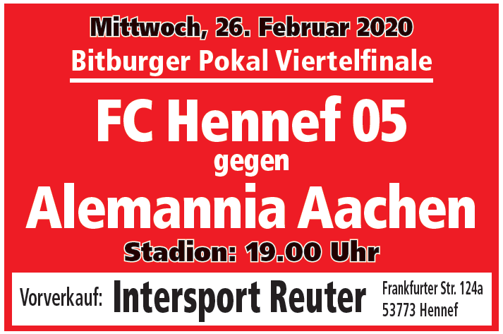 Stehplätze für das Pokalspiel in Hennef (26.2.) gibt es für 10€ (Vollzahler) bzw. 6€ (ermäßigt / begrenztes Kontingent). Darüber hinaus stehen wenige Sitzplätze zum Preis von 15€ zur Verfügung. Rollstuhlfahrer kaufen eine ermäßigte Stehplatzkarte, eine Begleitperson ist frei. Kinder bis 11 Jahre erhalten ausschließlich an der Tageskasse Freikarten für den Sitzplatzbereich ("Schoßkarten ohne eigenen Sitzplatz"). Bei Pokalspielen kann keine Mitgliederermäßigung gewährt werden. Es wird ein Bus zum Fahrpreis von 12€ angeboten, Abfahrt ist um 16:30 am Tivoli.