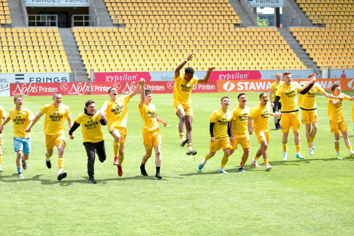 Auch die U17 von Alemannia Aachen blieb in den letzten Monaten ungeschlagen. Dank sieben Siegen in acht Spielen verbesserte sich das Team von Dirk Lehmann in der B-Junioren Mittelrheinliga nach Platz sieben zur Winterpause auf Platz vier zum Saisonende. „Wir haben unser Ziel erreicht, in die Top 5 zu kommen. Und wir hätten sogar mit einem Sieg im letzten Spiel auf dem zweiten Platz landen können. Mit der letzten Aktion bekommen wir in der Nachspielzeit den 3:3-Ausgleich gegen den 1. FC Düren", erklärt Lehmann rückblickend. Dennoch überwiegt der Stolz beim U17-Trainer: „Nach einer schwierigen Phase mit vielen Verletzten im Dezember, haben sich die Jungs toll weiterentwickelt. Bedanken möchte ich mich auch bei meinem Trainerkollegen Alija Probic und allen, die uns vor allem bei Auswärtsspielen unterstützt haben." Ein besonderes Highlight in dieser Saison 2022/2023 war für die U17 der Gewinn der Futsal-Meisterschaft West und der dritte Platz bei der Deutsche Futsal-Meisterschaft. Der jüngere Jahrgang der B-Junioren, die U16, von Alemannia Aachen durften Ende April feiern. In der Bezirksliga sicherte sich der Nachwuchs die Meisterschaft mit acht Punkten Vorsprung.