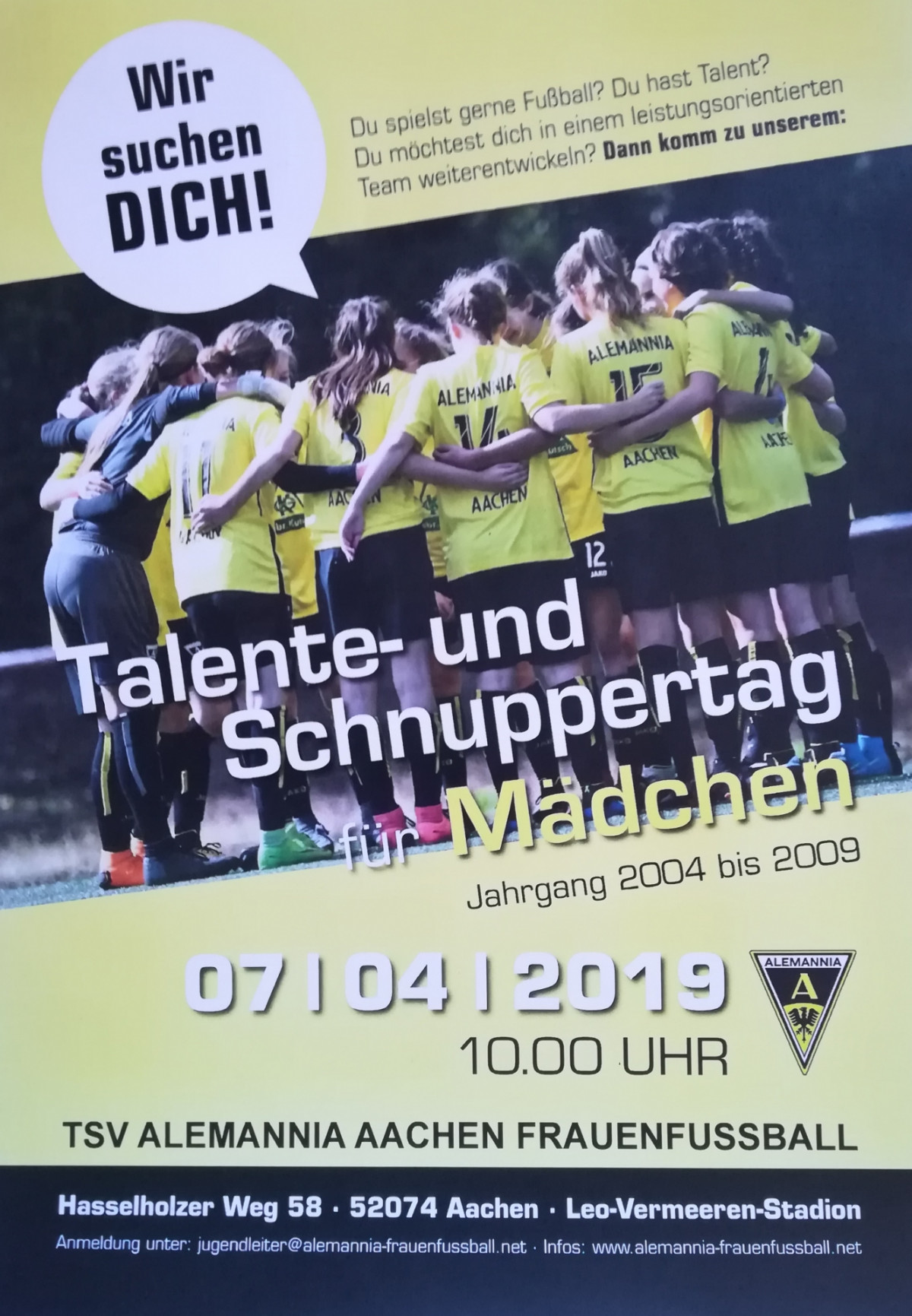 Die Talentsuche der Alemannia Aachen Juniorinnen startet für die Saison 2019/20 ab sofort. Die Juniorinnen von Alemannia Aachen freuen sich auf talentierte Spielerinnen nicht nur aus Deutschland, sondern auch aus den Niederlanden und Belgien. Melde dich unter jugendleiter@alemannia-frauenfussball.net zu einem Probetraining bei den Mädels von Alemannia Aachen an und zeig uns dein Talent!