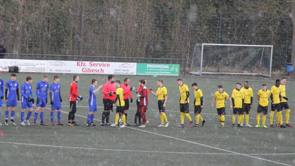 Gegen die eine Liga tiefer agierenden Gastgeber hatte U19-Trainer Herbert Meys im Vergleich zum letzten Ligaspiel etwas rotiert. Mit Marc Kleefisch, Patrick Rubaszewski und Luc Roex waren zudem drei Akteure am Vormittag noch im Testspiel der ersten Mannschaft zum Einsatz gekommen. Trotzdem übernahmen die Schwarz-Gelben vor rund 150 Zuschauern von Beginn an die Initiative. Im Abschluss fehlte allerdings die nötige Konsequenz. Die Hausherren lauerten auf Konter und hatten damit in der 11. Minute Erfolg. Giesen enteilte der Aachener Hintermannschaft und traf zum überraschenden 1:0. Als Heil nach einem Freistoß per Kopf auf 2:0 erhöhte (19.), roch es am Brühler Gallberg nach einer faustdicken Sensation.